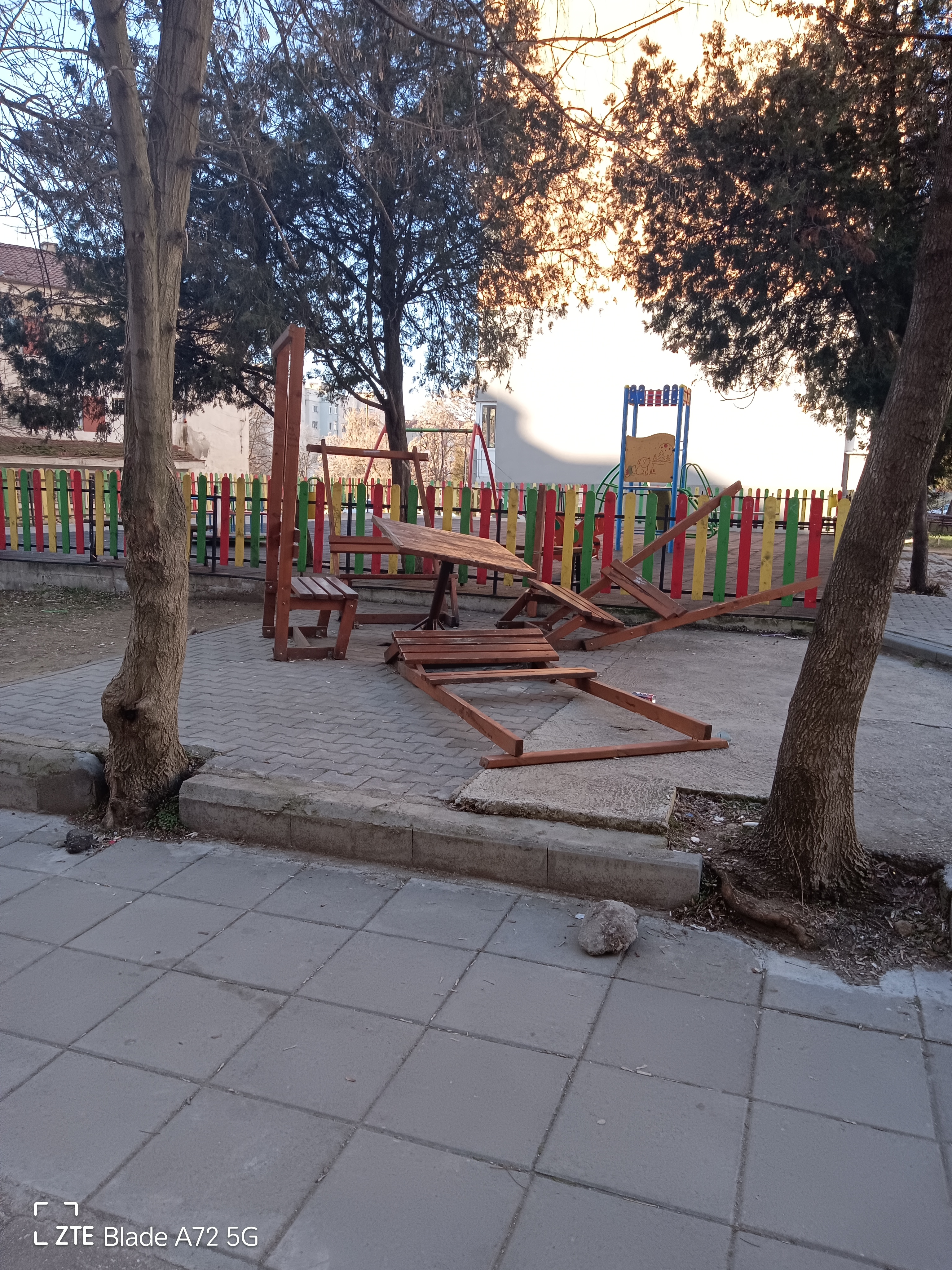 Беседката на детската площадка е счупена. Моля да се предприемат необходимите действия за нейното поправяне.