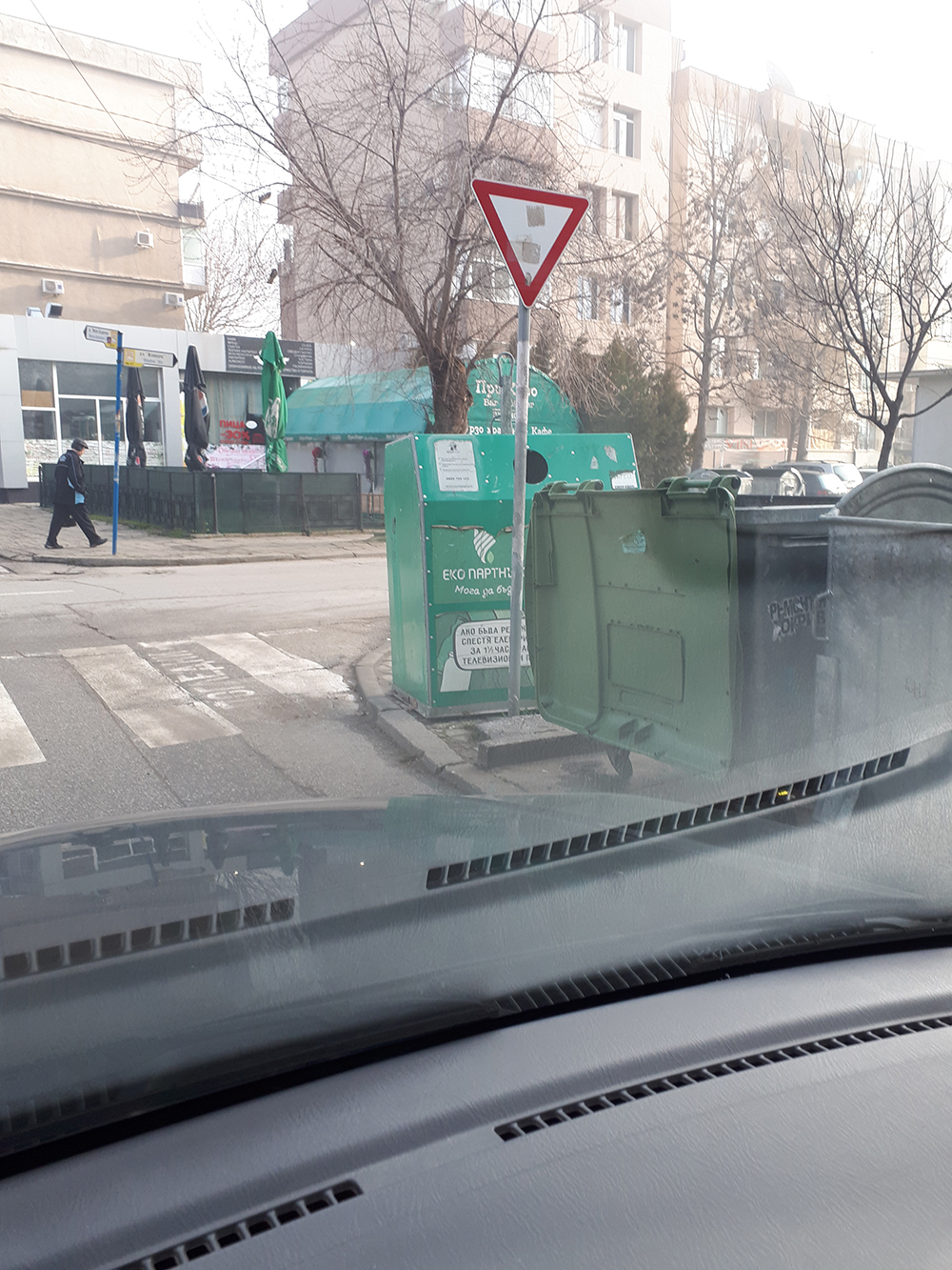Отново сигнализирам за опасен зелен контейнер, позициониран до пешеходната пътека, ограничава видимостта на автомобили и пешеходците, създавайки предпоставка за инцидент!