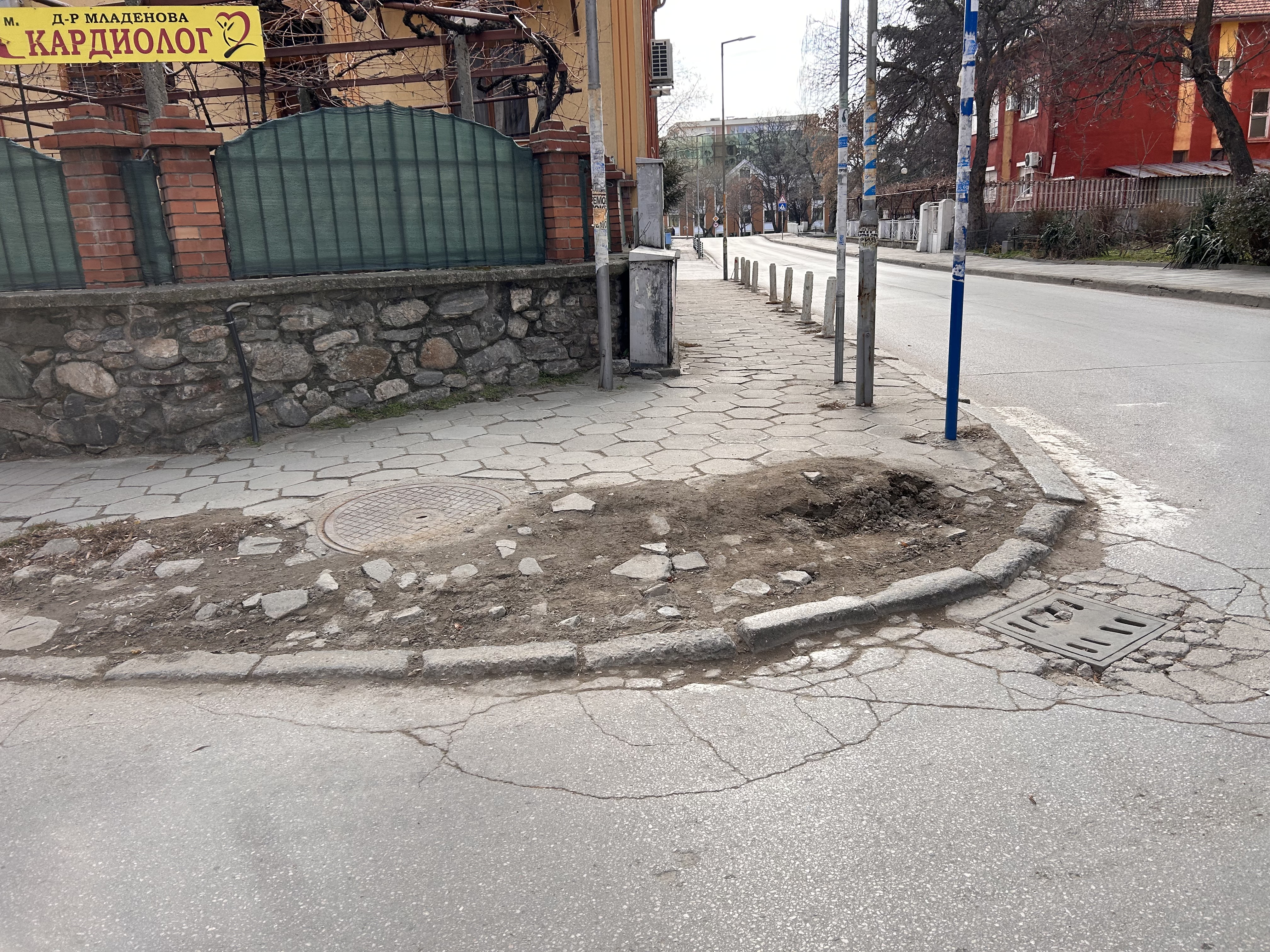 От 3-4 години се обаждам в общината за този тротоар.Става въпрос за ъгъла на ул. „Доктор Христо Татарчев“ и ул. „Пере Тошев“. Тротоарът е изцяло разбит от строителни камиони при завоя. Това го прави опасен за пресичане, особено на пешеходната пътека, която липсва на цялото кръстовище. Освен това, всеки ден коли спират на аварийни светлини на ул. „Пере Тошев“, което принуждава пешеходците да слизат на улицата, защото тротоарът е тесен.