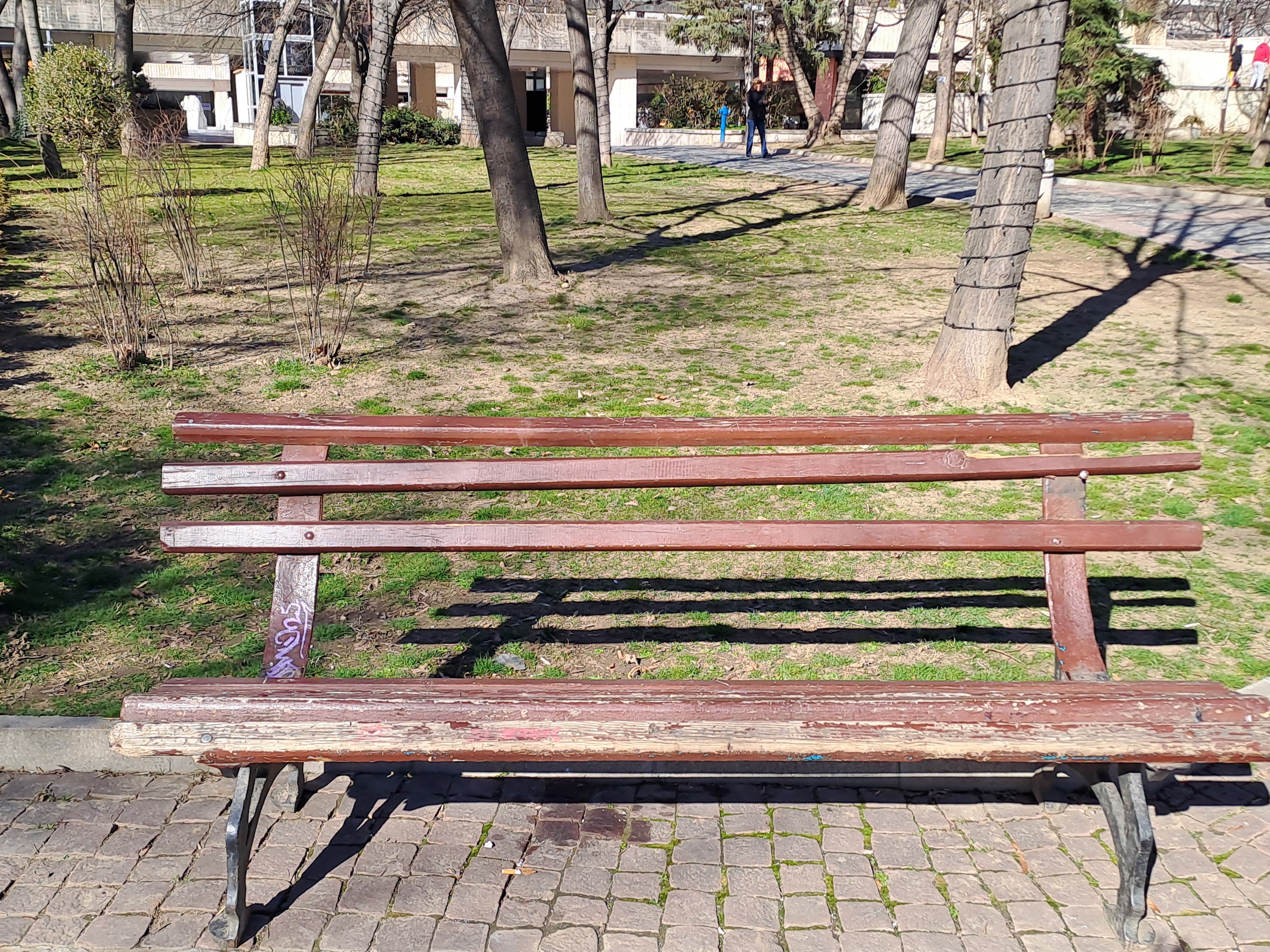 Снимката показва пейка в Градската градина с една счупена летва, която се нуждае от ремонт.