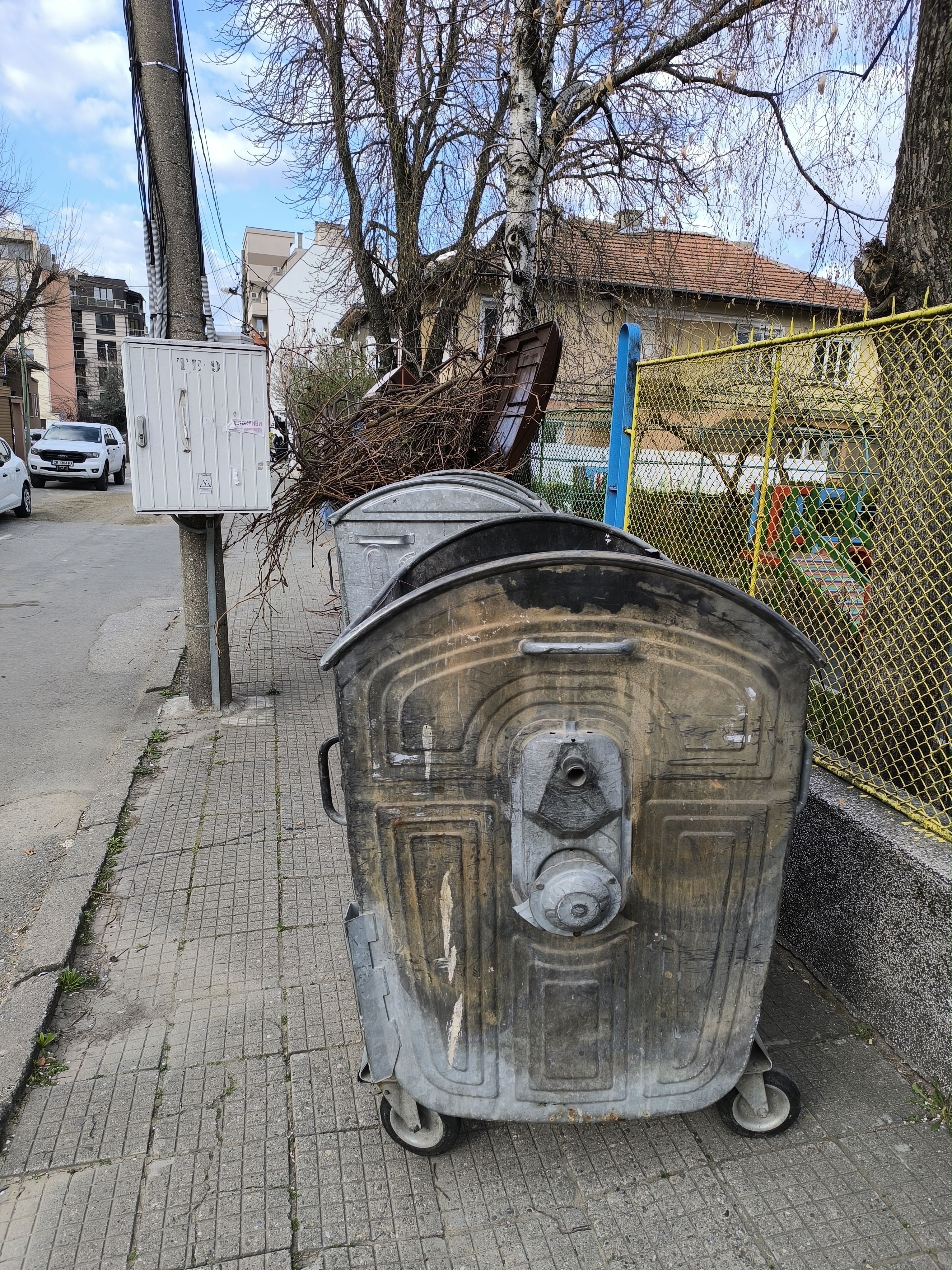 Кофите за боклук са на тротоара и са пълни с боклук, което прави преминаването на пешеходци невъзможно. Кофите трябва да са поставени на обособените за това места, а не да се намират на тротоара.