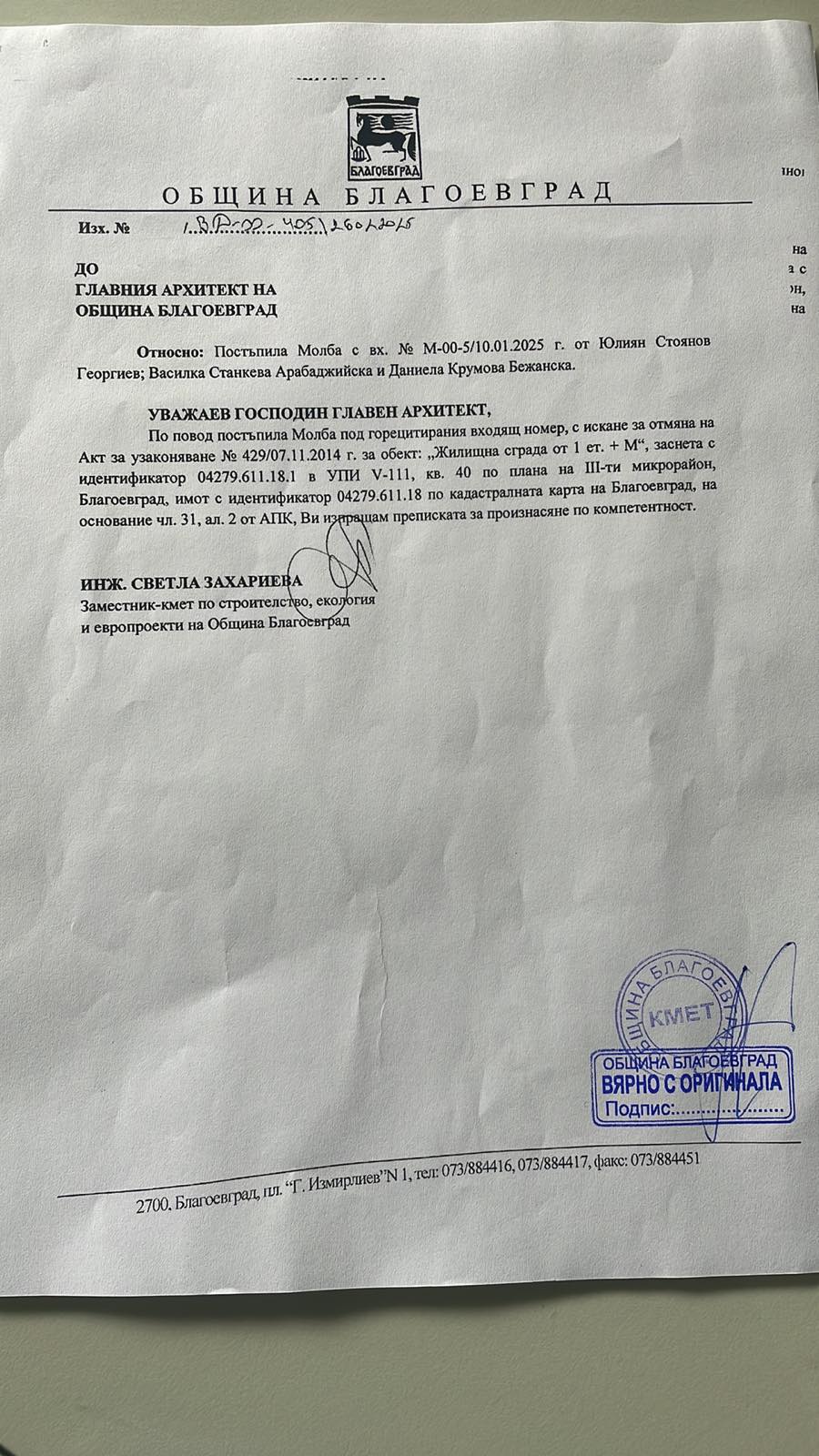 Във връзка с молбата ни сте ни изпратили документ с който зам.кмет по строителство е изпратил преписка по което трябва да се произнесе по компетентност.Въпроса ни е ,кога ще се случи това и въобще да очакваме ли отговор.Прилагаме съответния документ.
