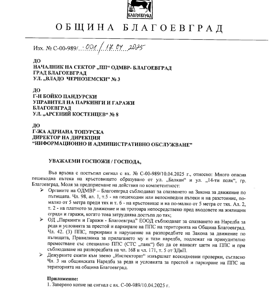 Здравейте. Има доста опасна пешеходна пътека при улица Балкан ,при включването за 14ти Полк. Там ежедневно паркират коли и спират видимостта и на идващите коли (каращи бързо , за да се включат ) ,и на пешеходците. Аз съм млада майка с бебенце и не за първи път ще ни блъснат там. Нека се вземат мерки преди да стане беля, защото наистина децата и живота са най- ценното нещо.