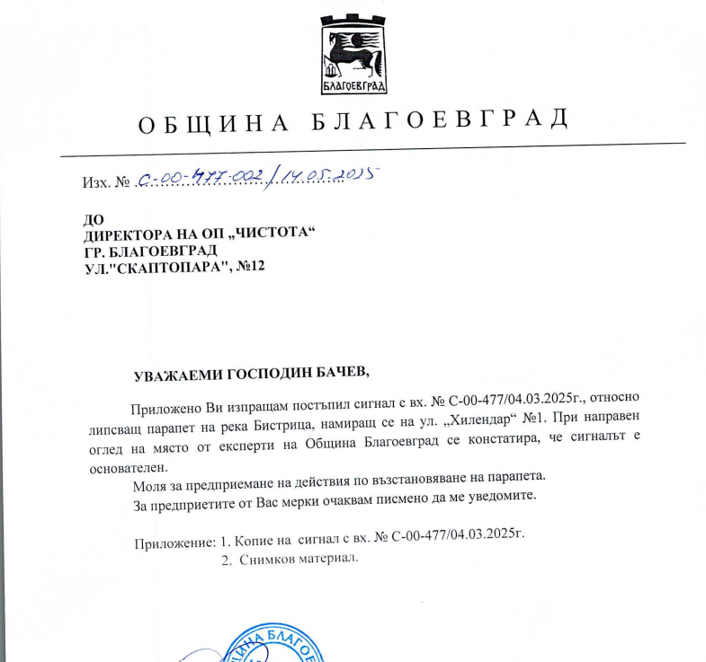 Благодарим Ви за предоставената информация. На дата 14.05.2025 г. въстановяването на парапета е възложено на ОП „Чистота Благоевград“ чрез писмо с изх. №С-00-477-002. Потвърждение за извършените ремонтни монтажни дейности е получено на дата 09.06.2025 г. с писмо №П-00-875.