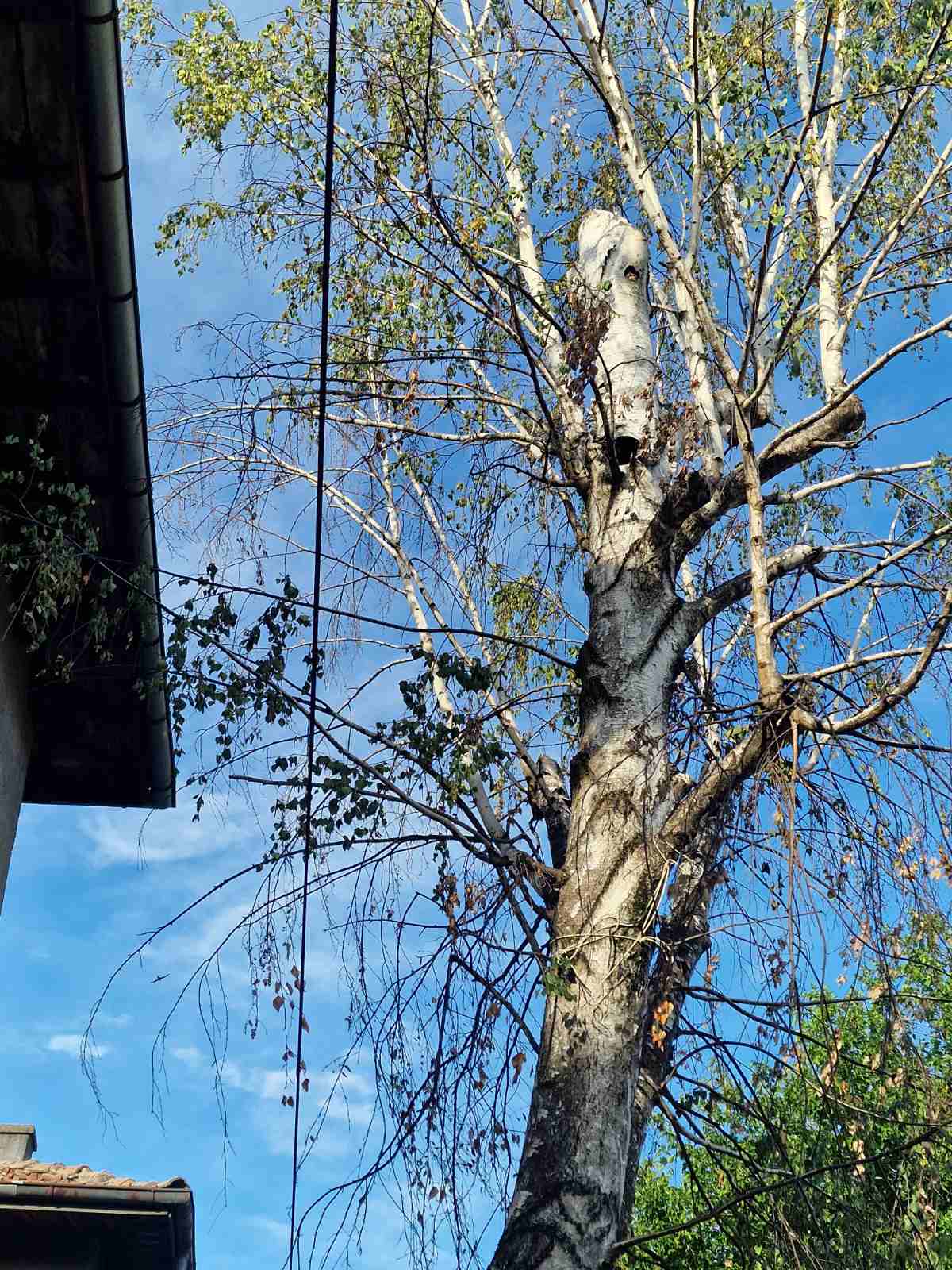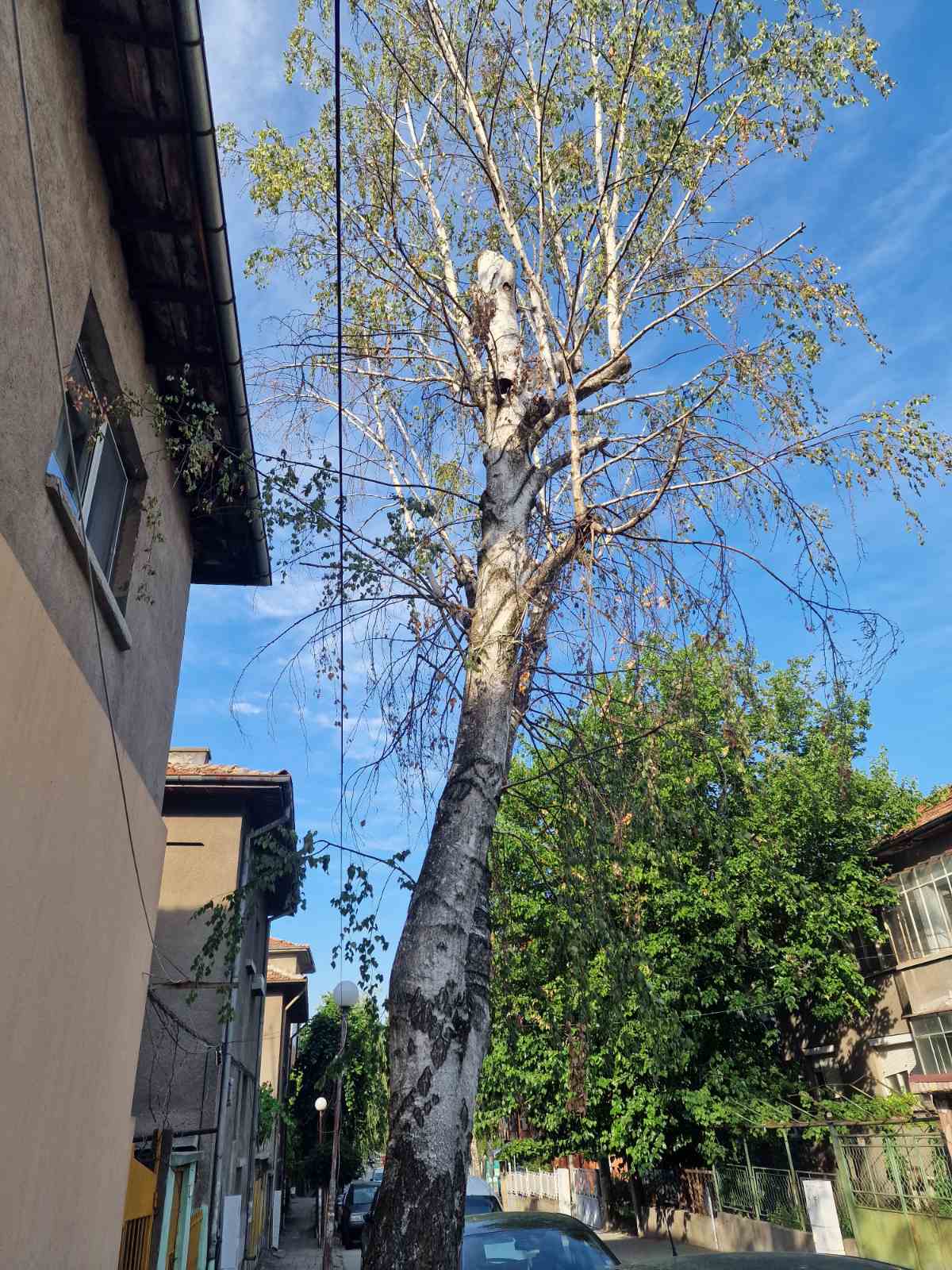 Моля за съдействие и отстраняване на изсъхнало и опасно дърво-бреза на адрес: ул Скаптопара №23. Прилагам снимки, с които доказвам че дървото е повече от опасно освен за къщата (клоните са върху покрива, има дупка в стъблото и е изсъхнало повече от половината) нарушени са и плочките по тротоара.