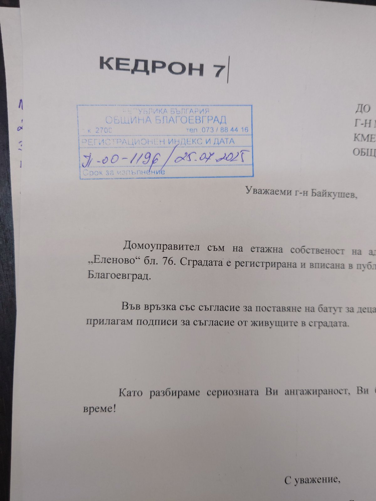 Батутът, разположен в градинката под терасите на бл. 76 в ж.к. Еленово, представлява сериозен проблем за живущите в района. Всяка вечер децата играят на него до късно и създават силен шум, който нарушава спокойствието и комфорта ни. Изразяваме несъгласие с това съоръжение на това място и настояваме за своевременно разглеждане на проблема и предприемане на мерки.