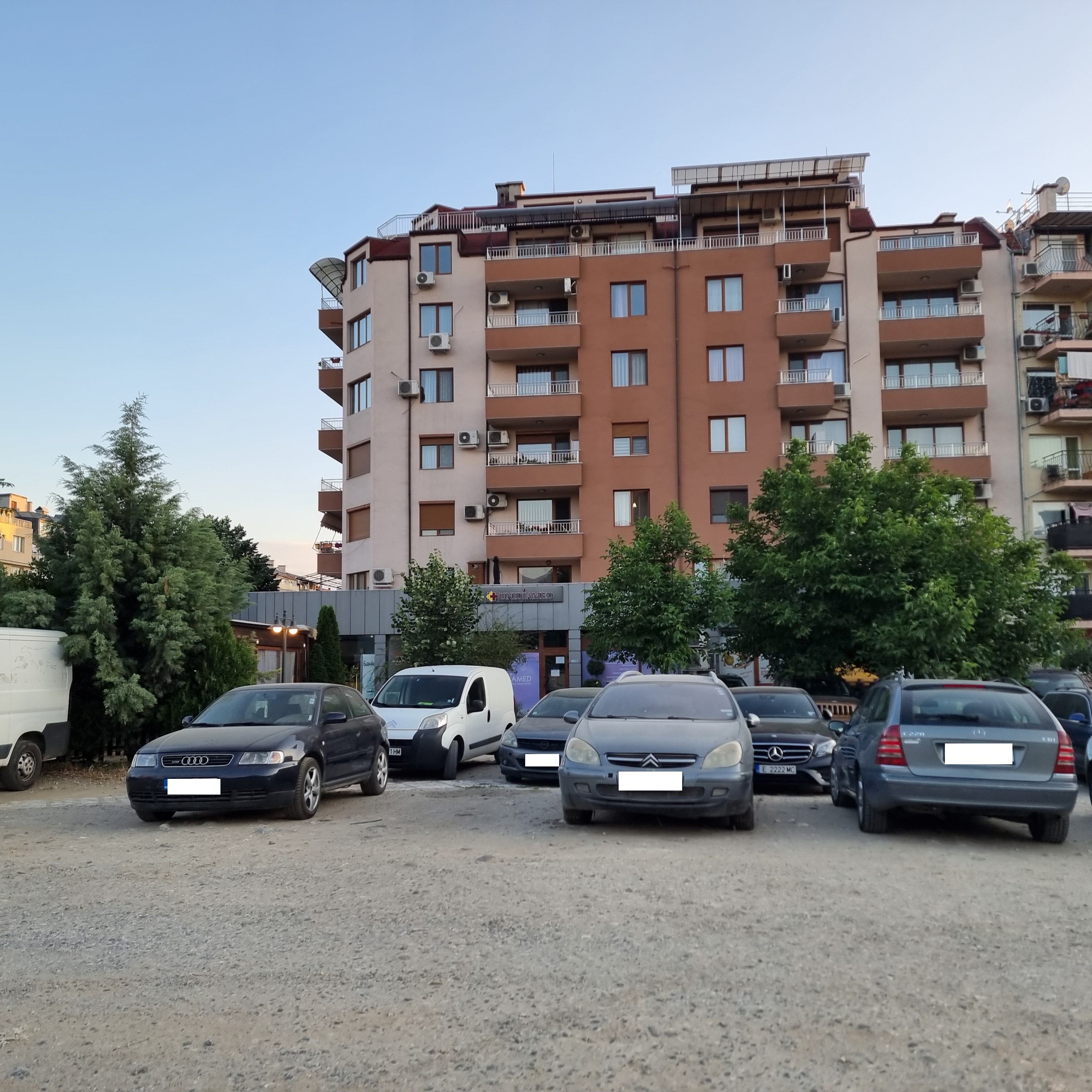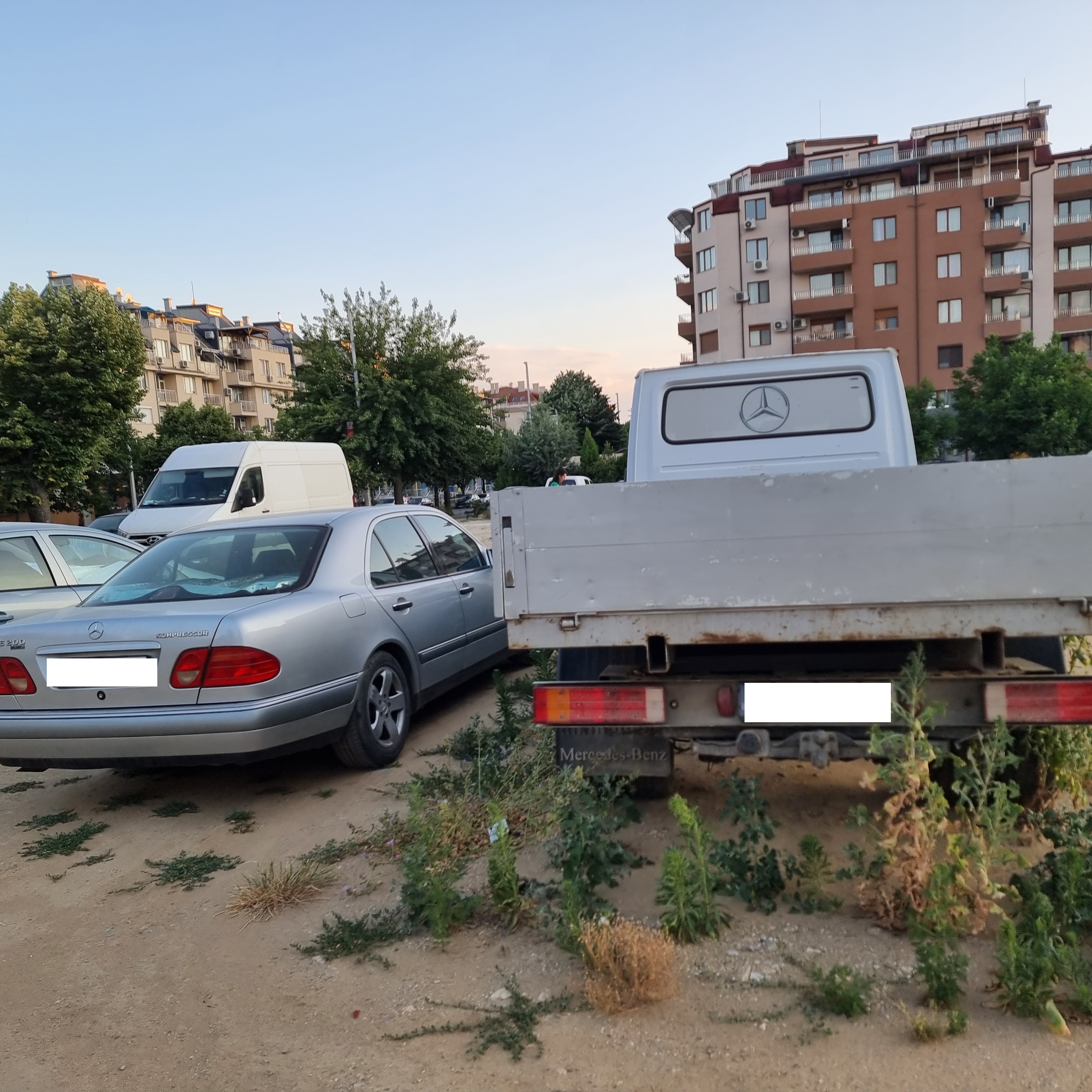 тази "зелена площ" е превърната в нерегламентиран паркинг и има няколко изоставени автомобили.