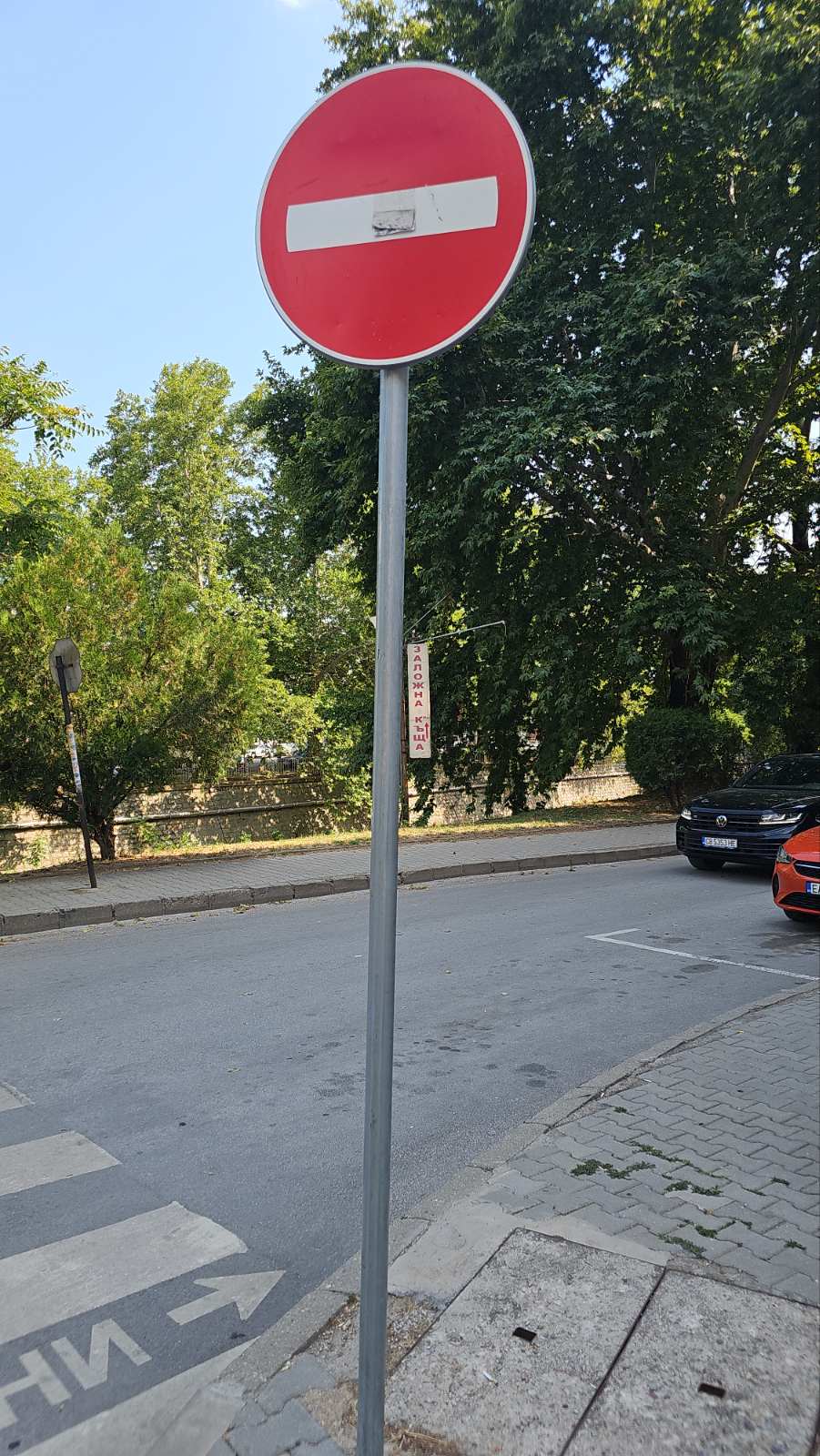 Ударен и изкривен пътен знак,който всеки момент може да се откъсне от тротоара и да падне върху някой човек