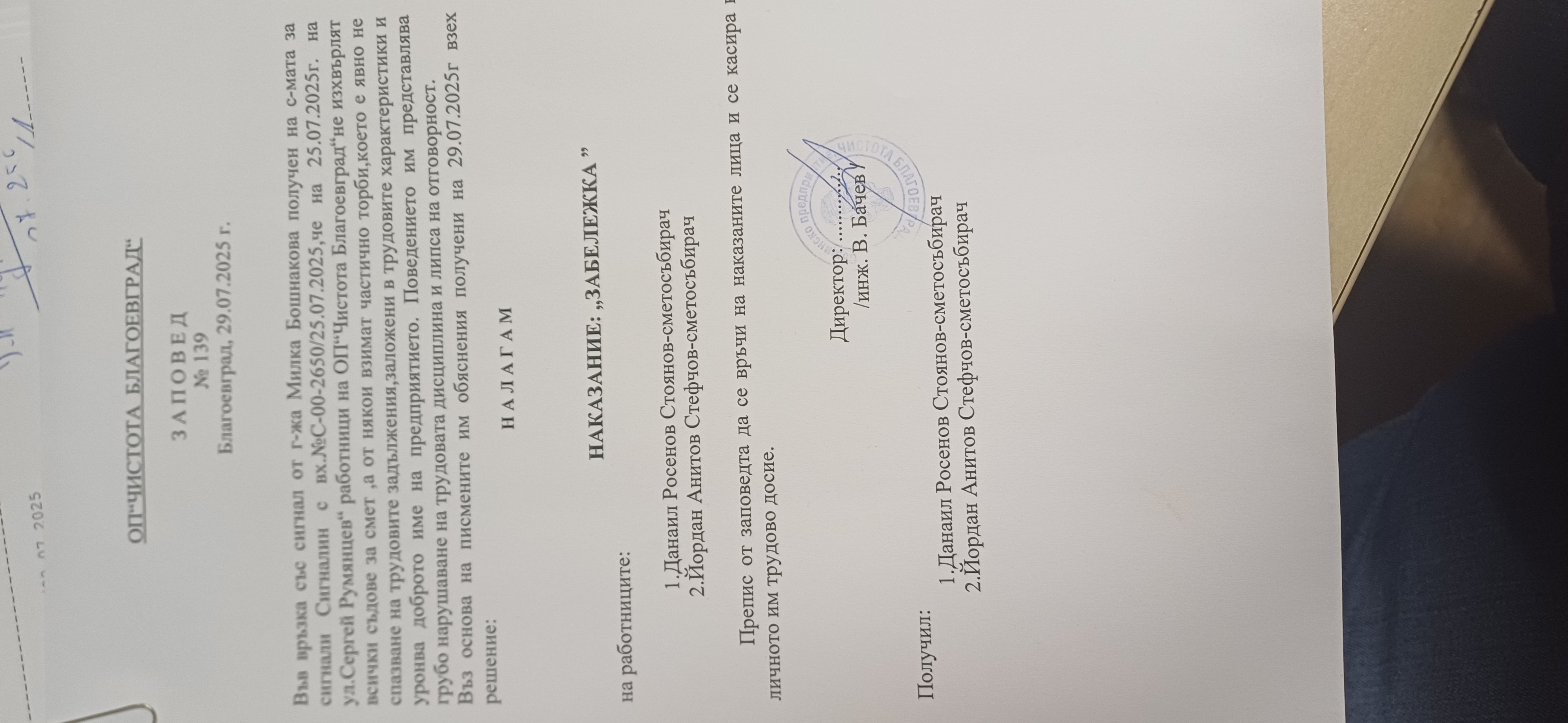 Наложено е наказание на сметосъбирачите.