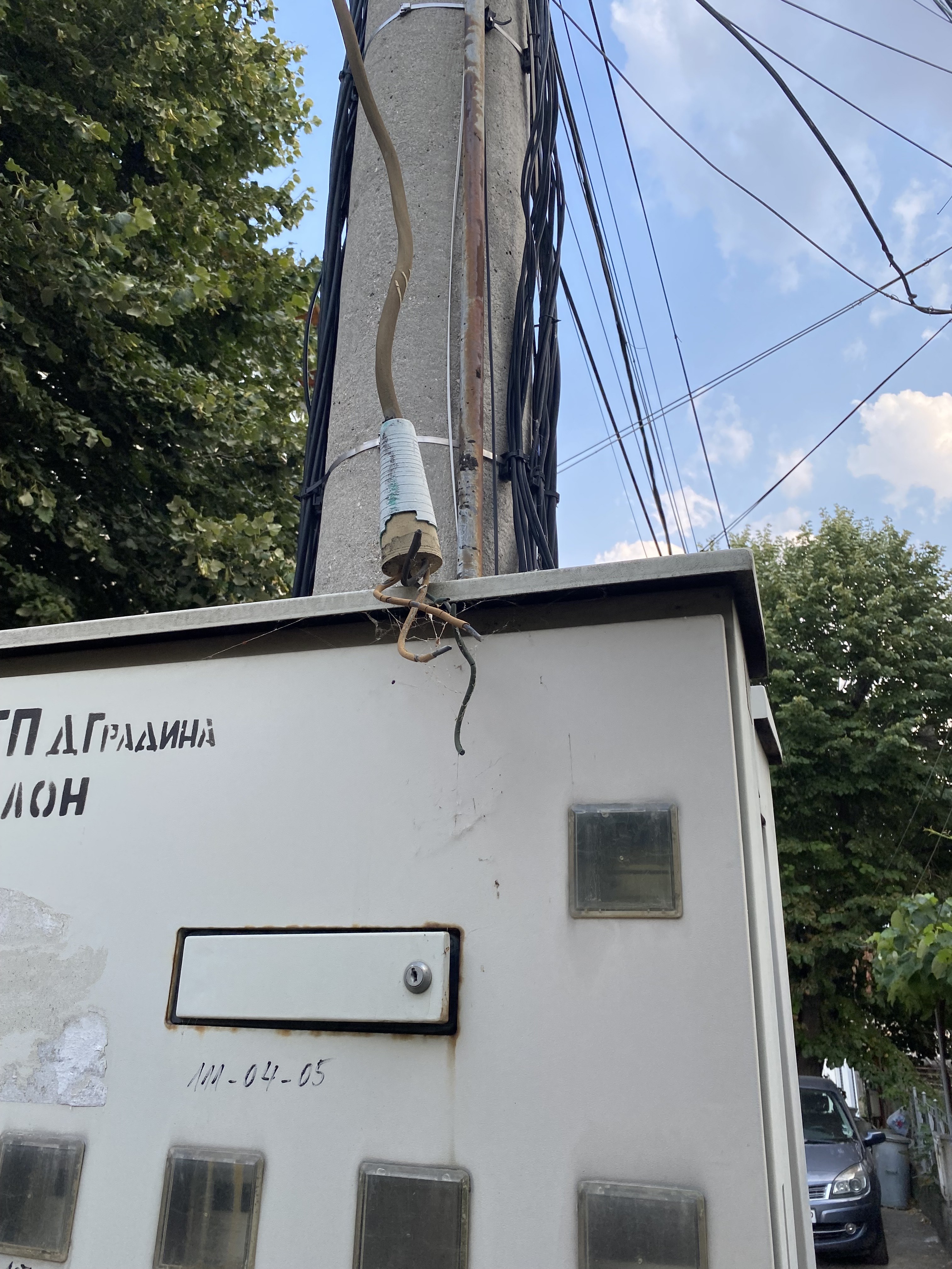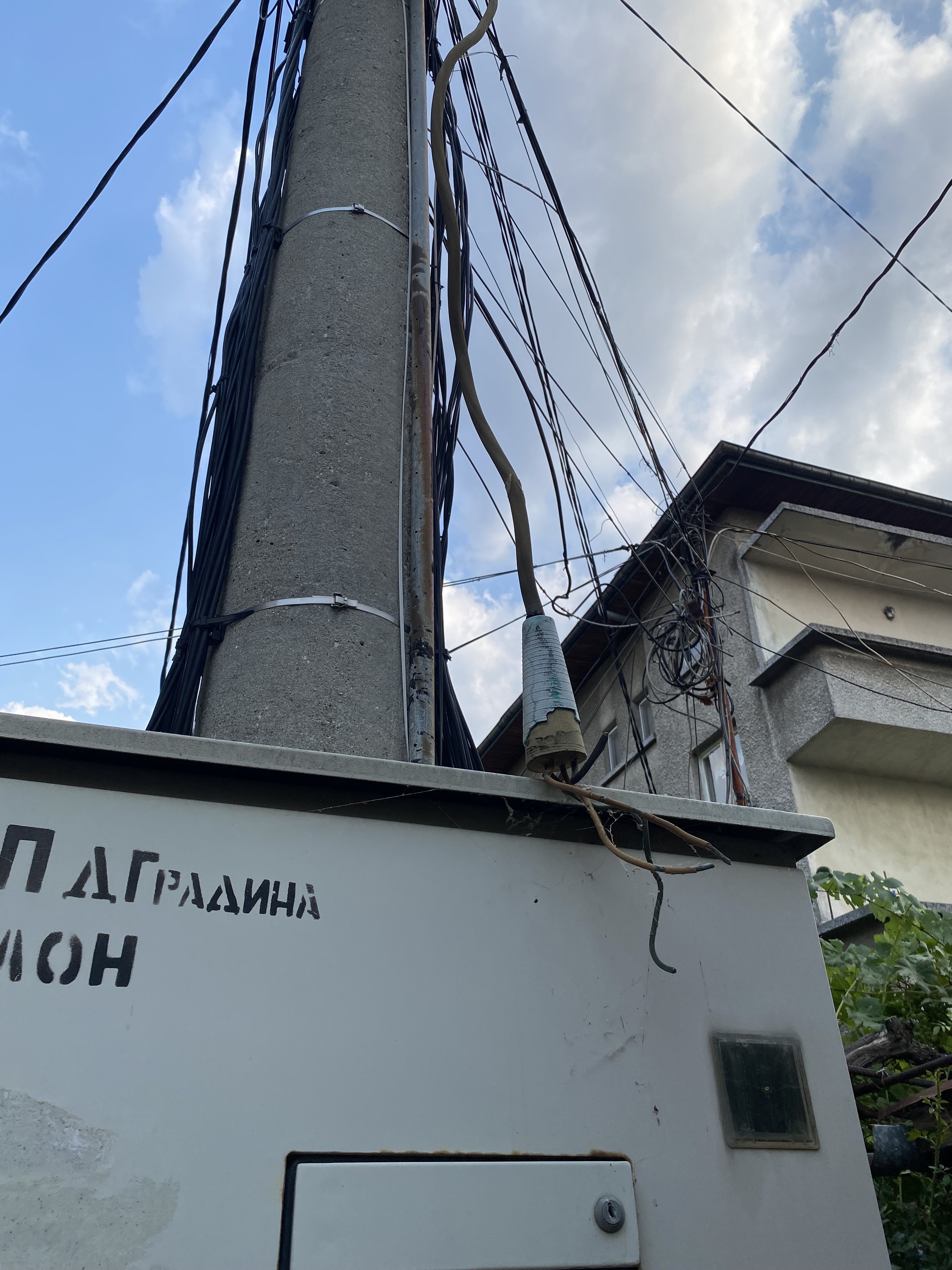 Живея на ул. „Искър“ 7. Бих искал да подам сигнал за опасен кабел, който виси от електрически стълб пред сградата. Както се вижда от приложената снимка, кабелът е оголен и създава сериозна опасност за преминаващите хора. Моля за спешни действия по отстраняването му.