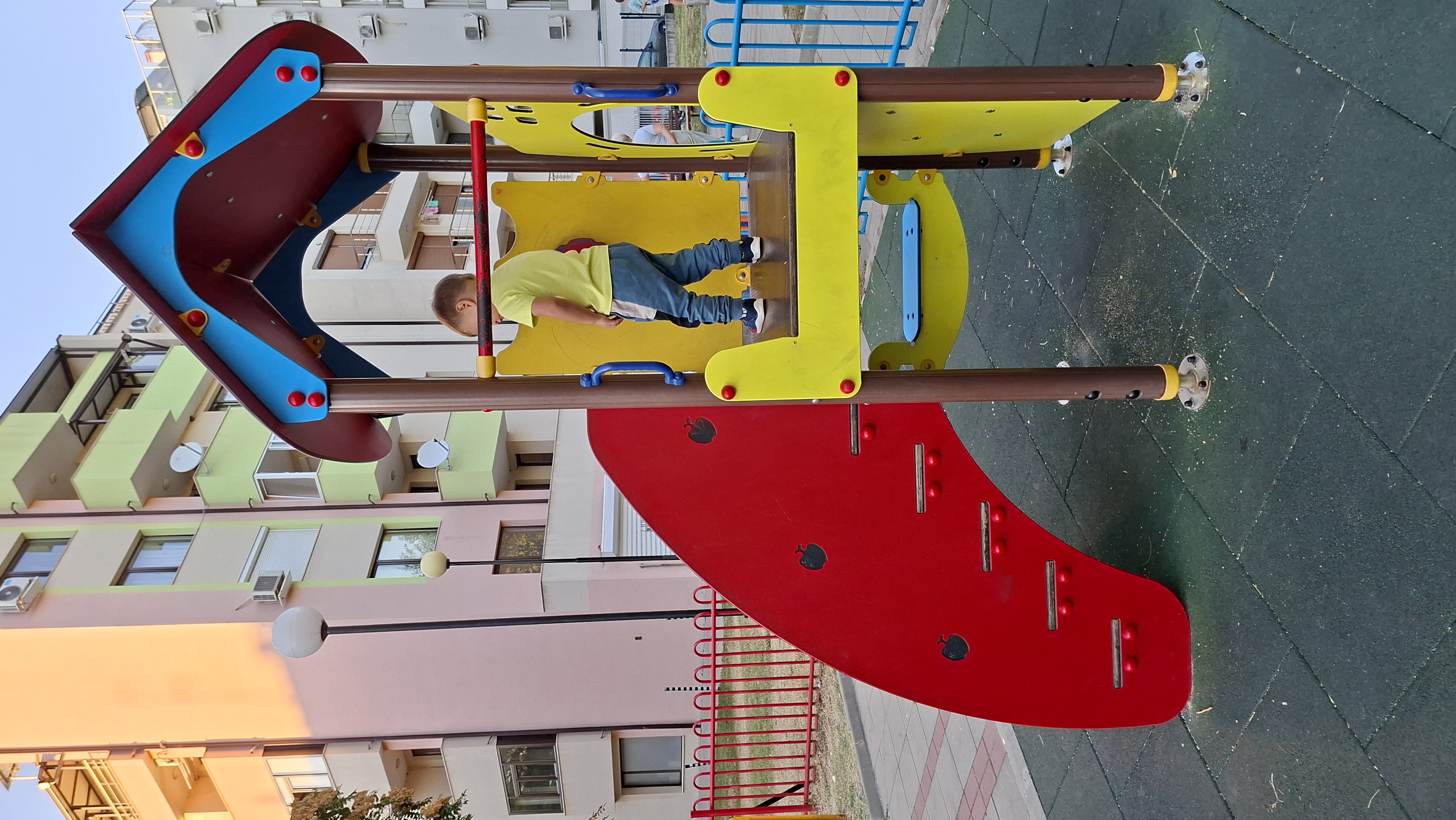 В новоремонтираната площадка, находяща се срещу общежитията на АУБГ, в близост до моста на бул. "Джеймс Баучер", едно от съоръженията е счупено или повредено, което създава опасност за играещите деца. На площадката има общо една пързалка и две люлки, втората пързалка е счупена.