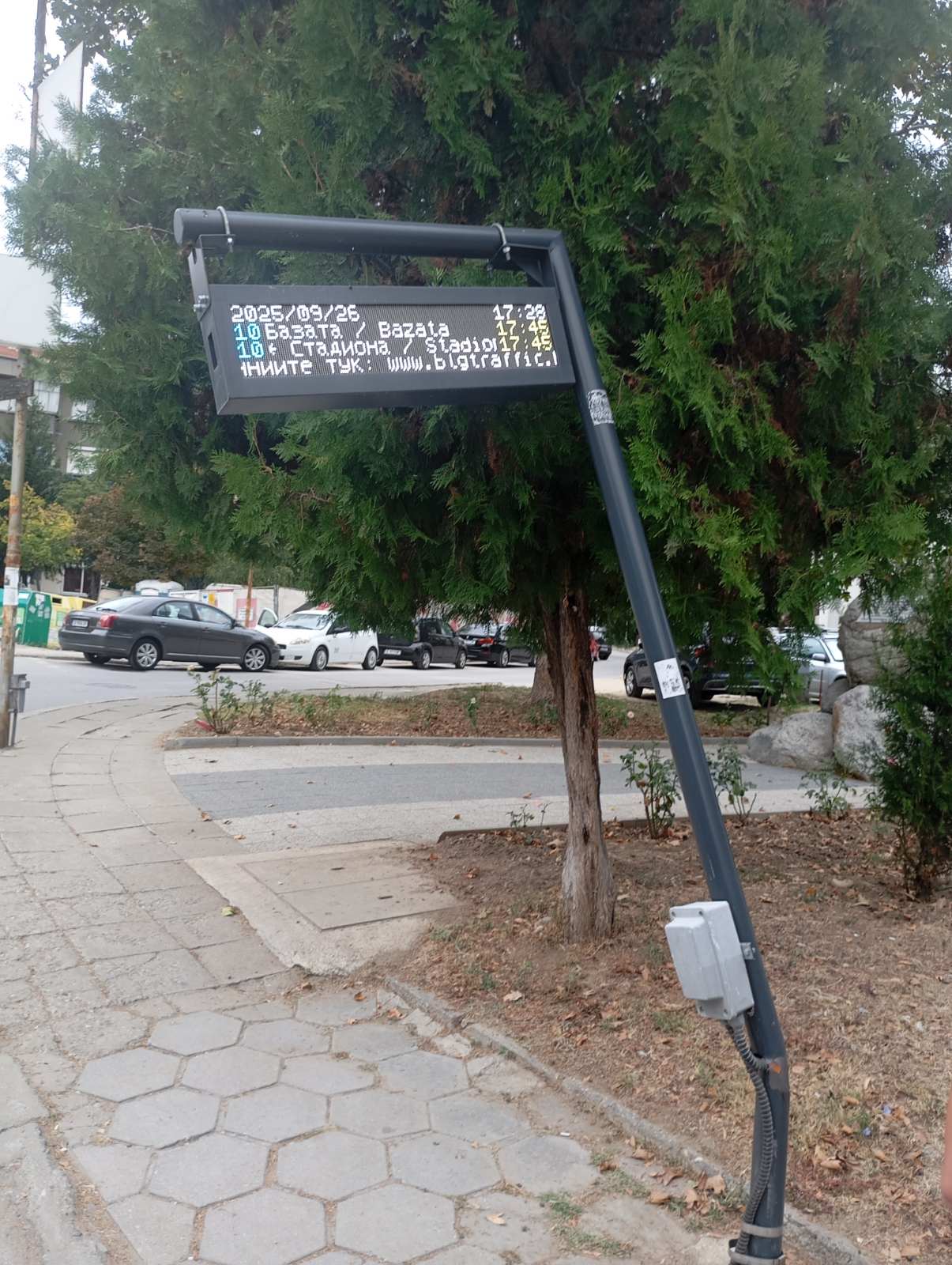 Електронното табло на спирката на автобус 10 е изкривена и има опастност да падне.