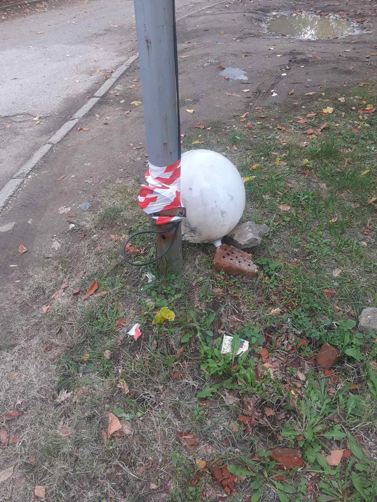 Екип от „Паркинги и гаражи“ е закачил лампата, която впоследствие е паднала на земята. Моля да бъдат предприети необходимите действия.