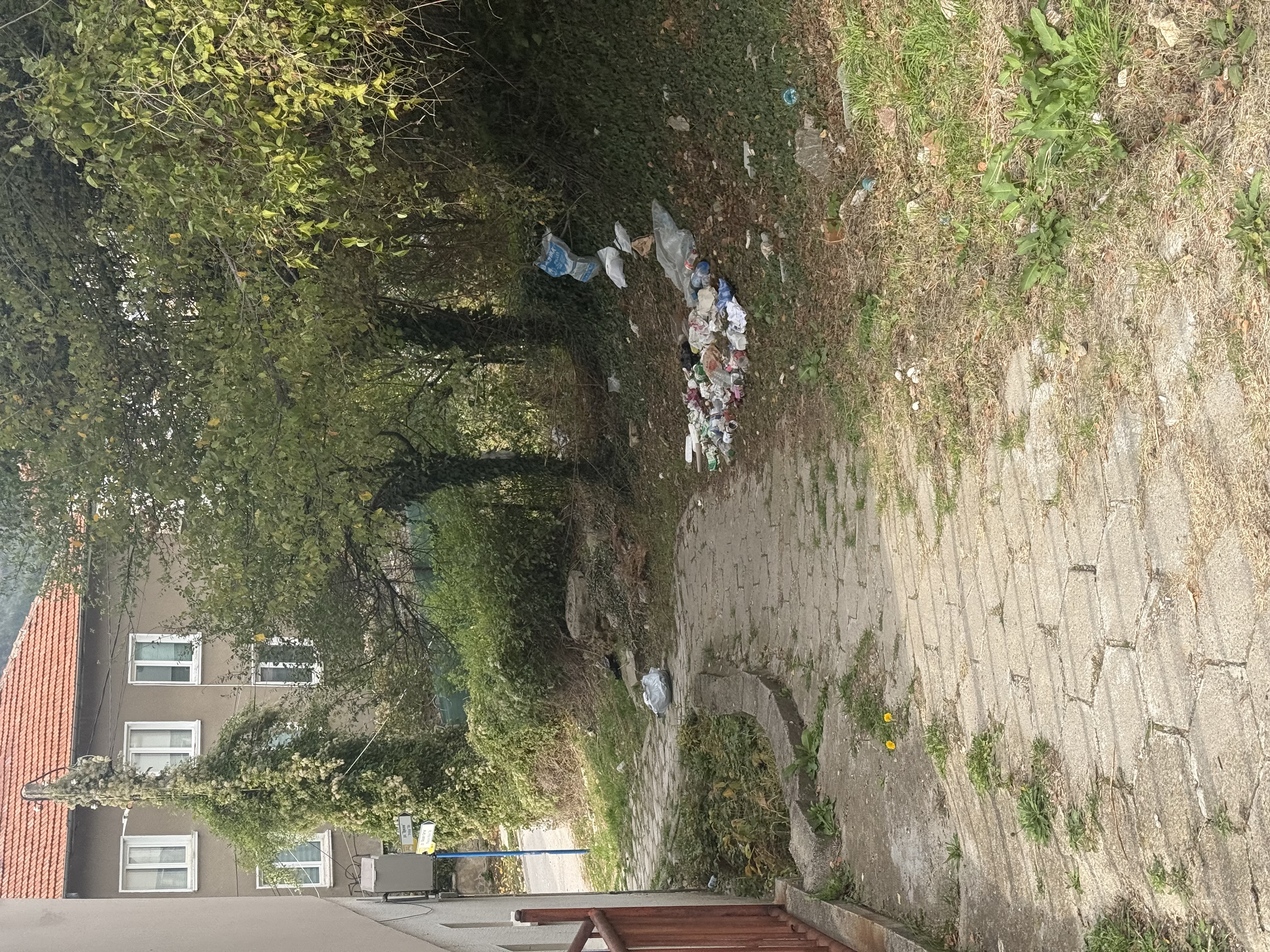На посоченото място има изхвърлени отпадъци върху зелената площ, до пешеходната алея. Замърсяването е върху общинска територия и създава неприятен и неестетичен вид на района, като същевременно затруднява преминаването на