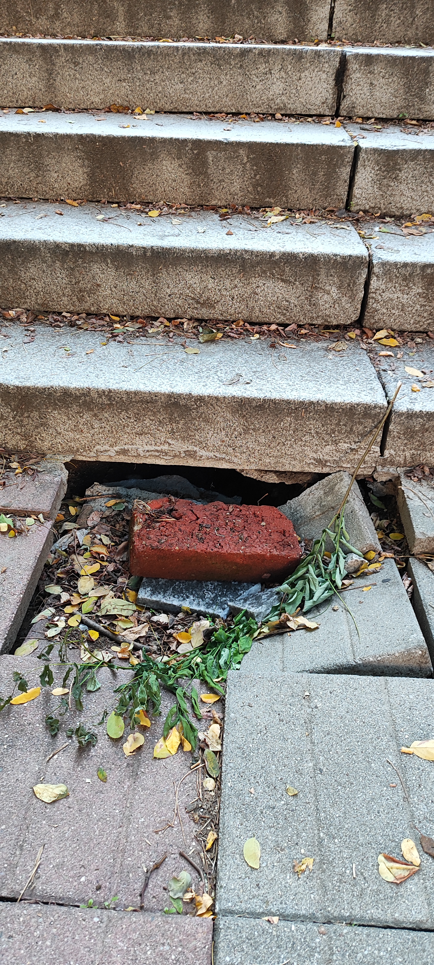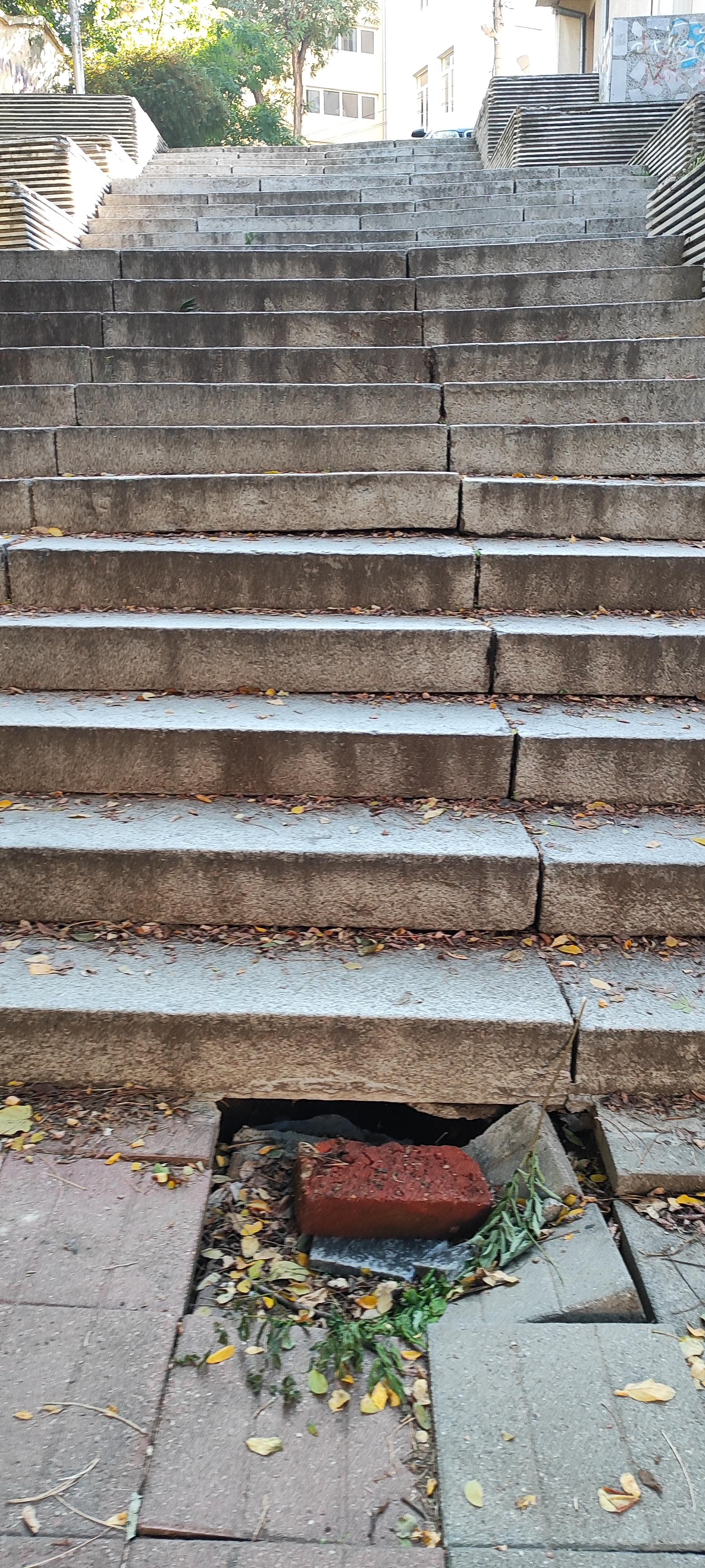 Стълбището до СУИЧЕ „Св. Климент Охридски“ е в лошо състояние – има пропаднали и напукани стъпала, както и липсващи елементи, които създават сериозен риск от инциденти за преминаващите, особено за учениците.“