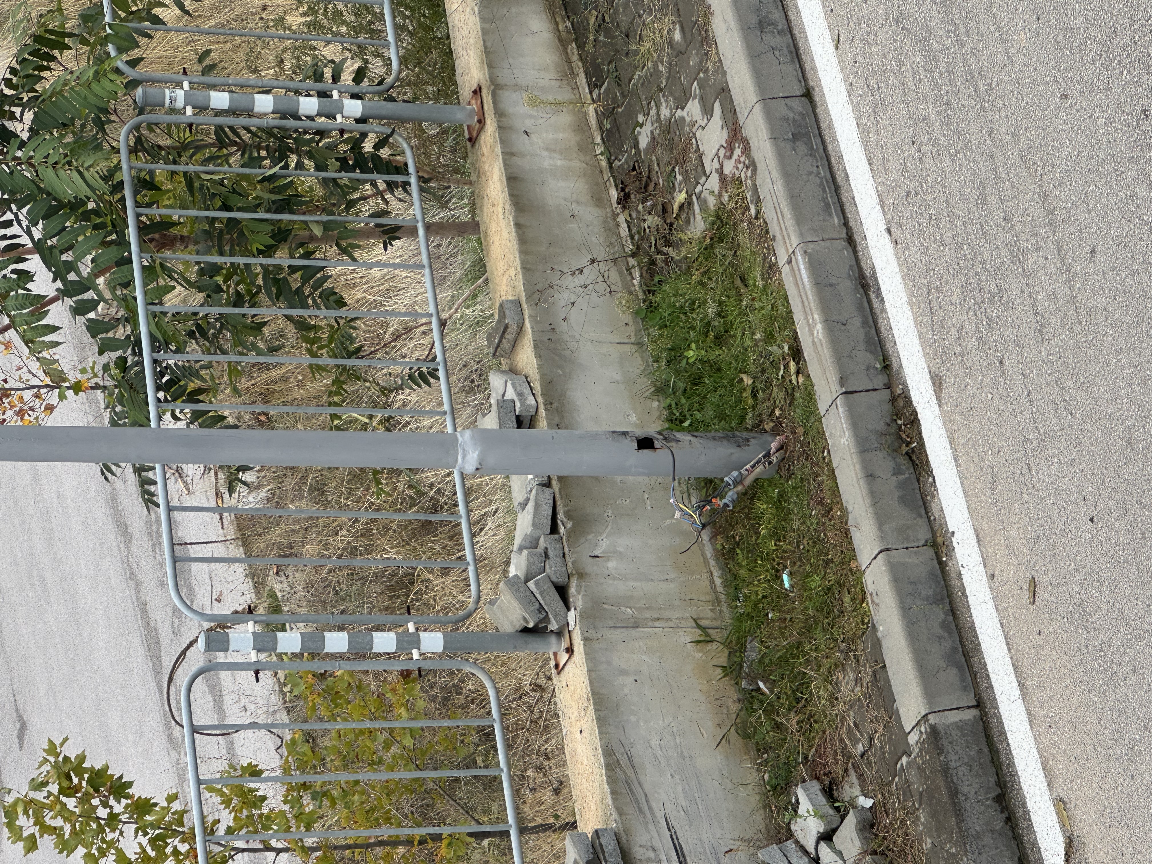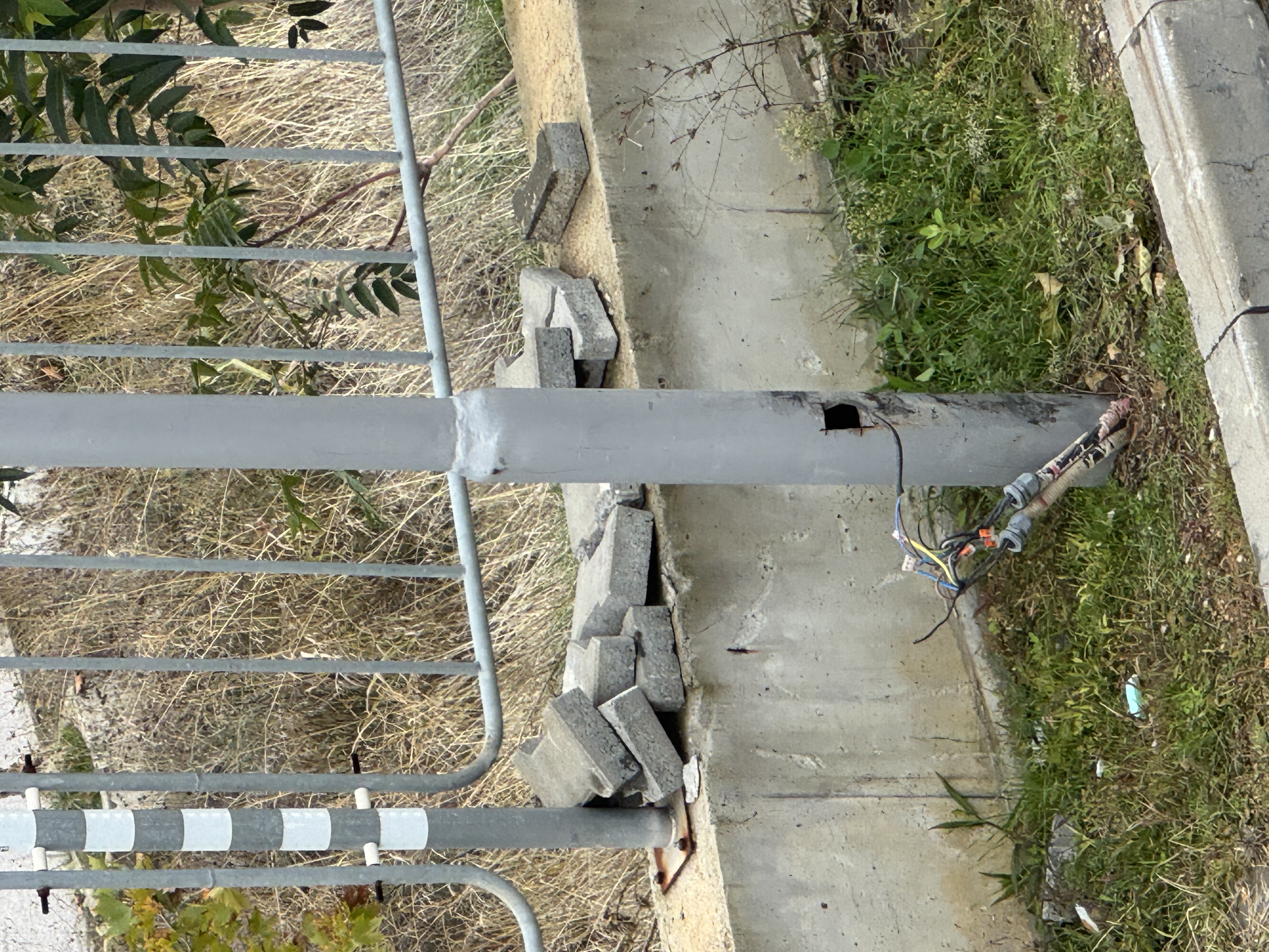 Кутията на стълба е счупена и висят жици по които има напрежение опасно за живота на преминаващите.