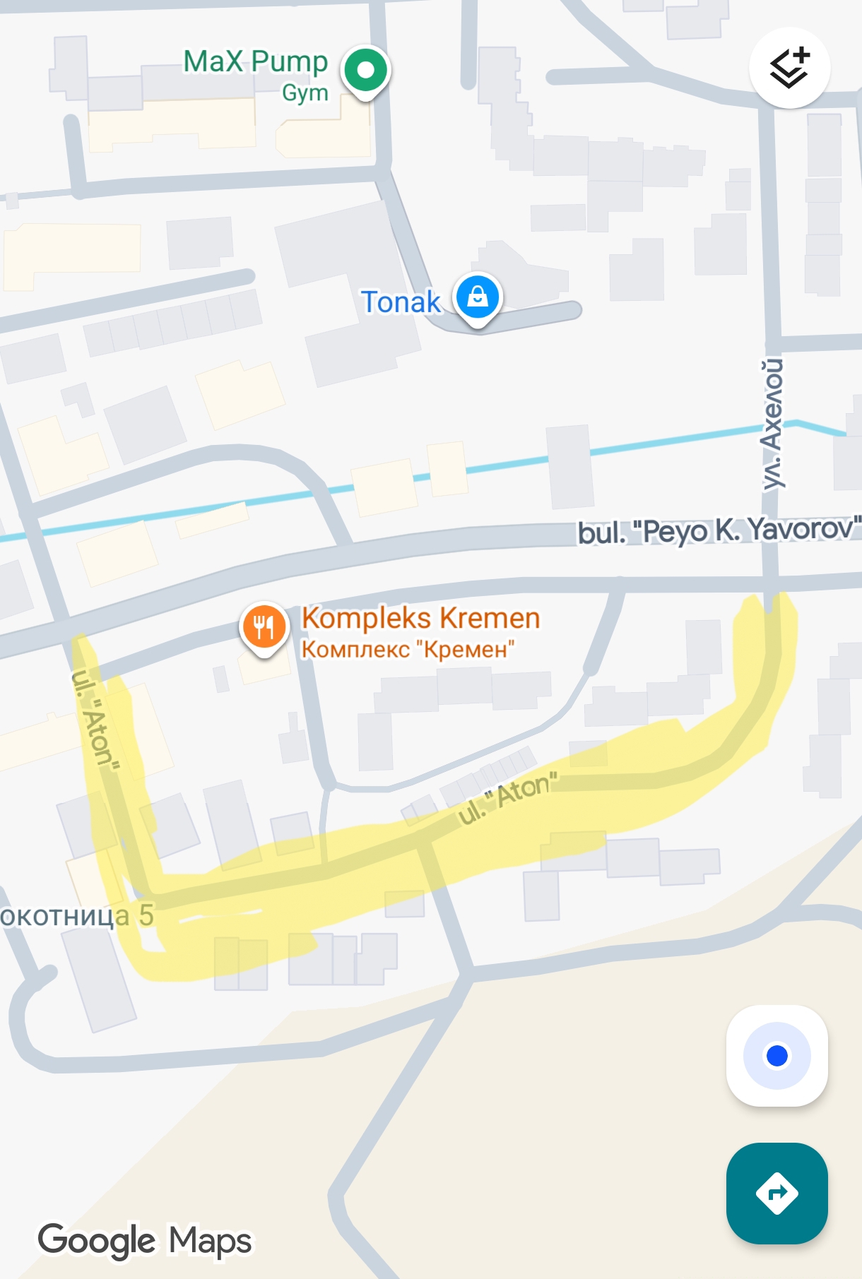 Искам да предложа улица Атон, в частта си южно от бул. "Пеьо К. Яворов" (маркирана в жълто на прикачената карта) да стане еднопосочна. Живущите паркират автомомили и от двете страни на улицата (от едната страна успоредно, с от другата перпендикулярно) и особенно след 17:00ч по цялата дължина на улицата няма къде две срещуположно движещи се автомобила да се разминат. Освен това в голямата си част улицата е дъгообразна и при навлизане няма как да се види, и съответно изчака насрещно движещата се кола. Това води до ситуации в които, единия трябва да отстъпи и да връща назад, понякога доста дълго разстояние. Ако бъде променена организацията на движението и улицата стане еднопосочна, мисля, че ще бъде много по-удобно и безопасно за всички.