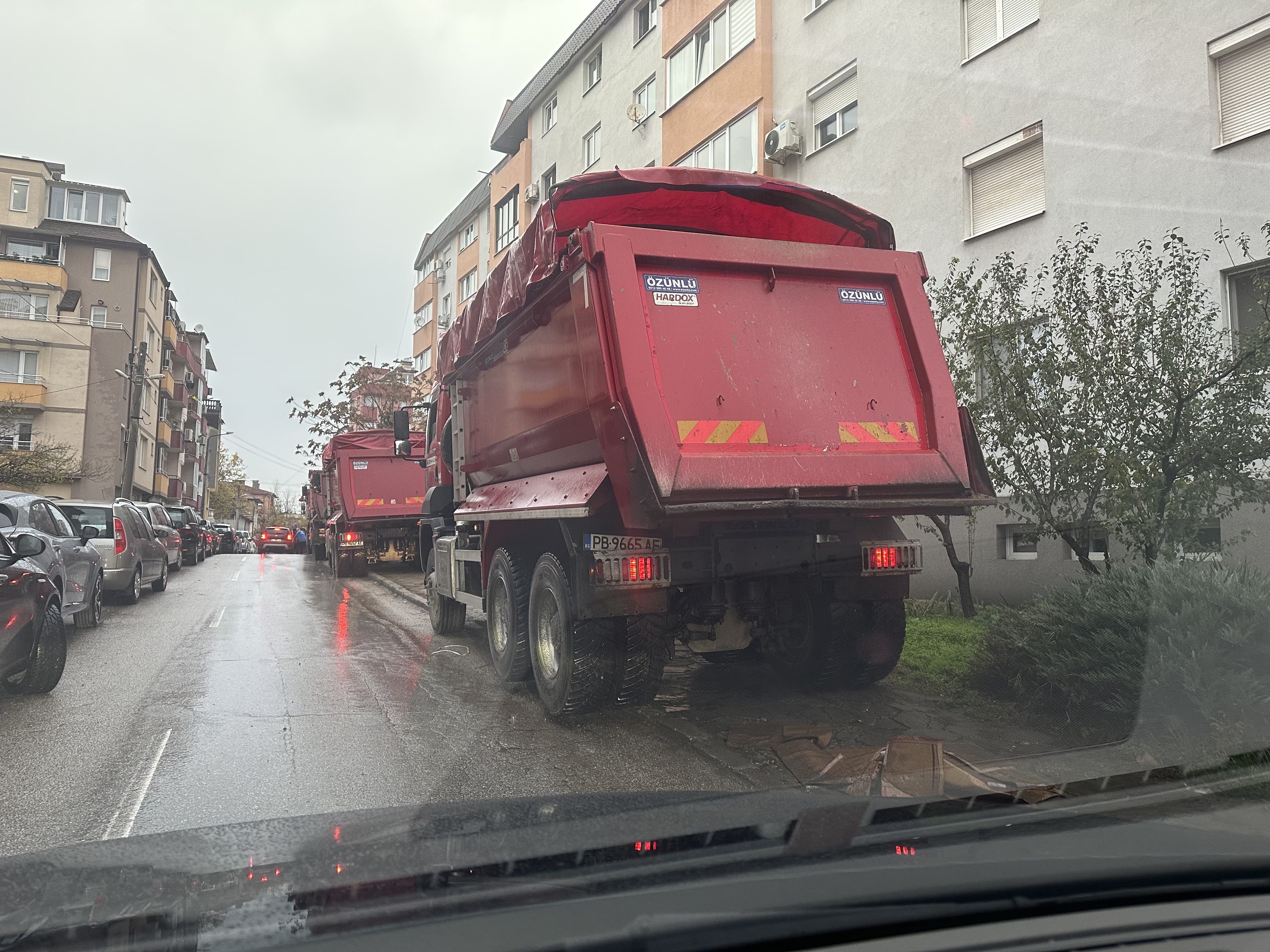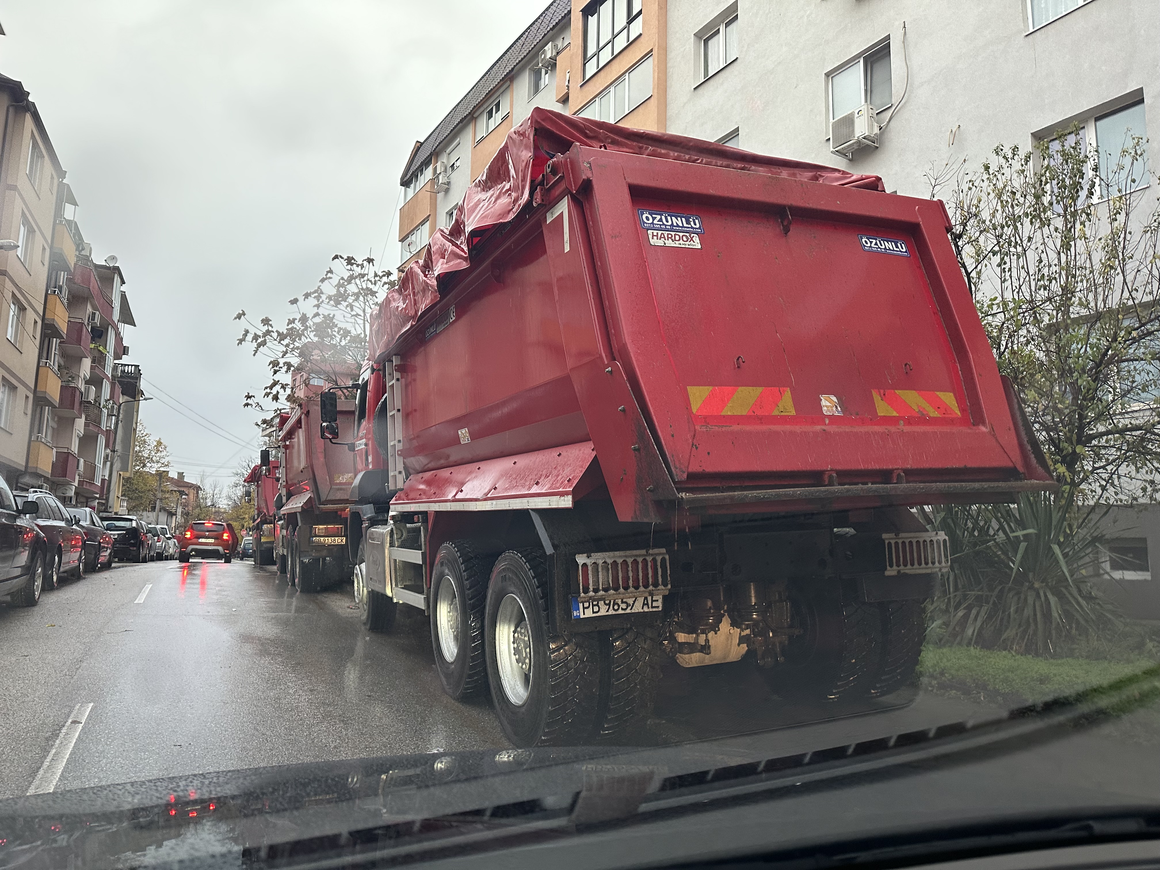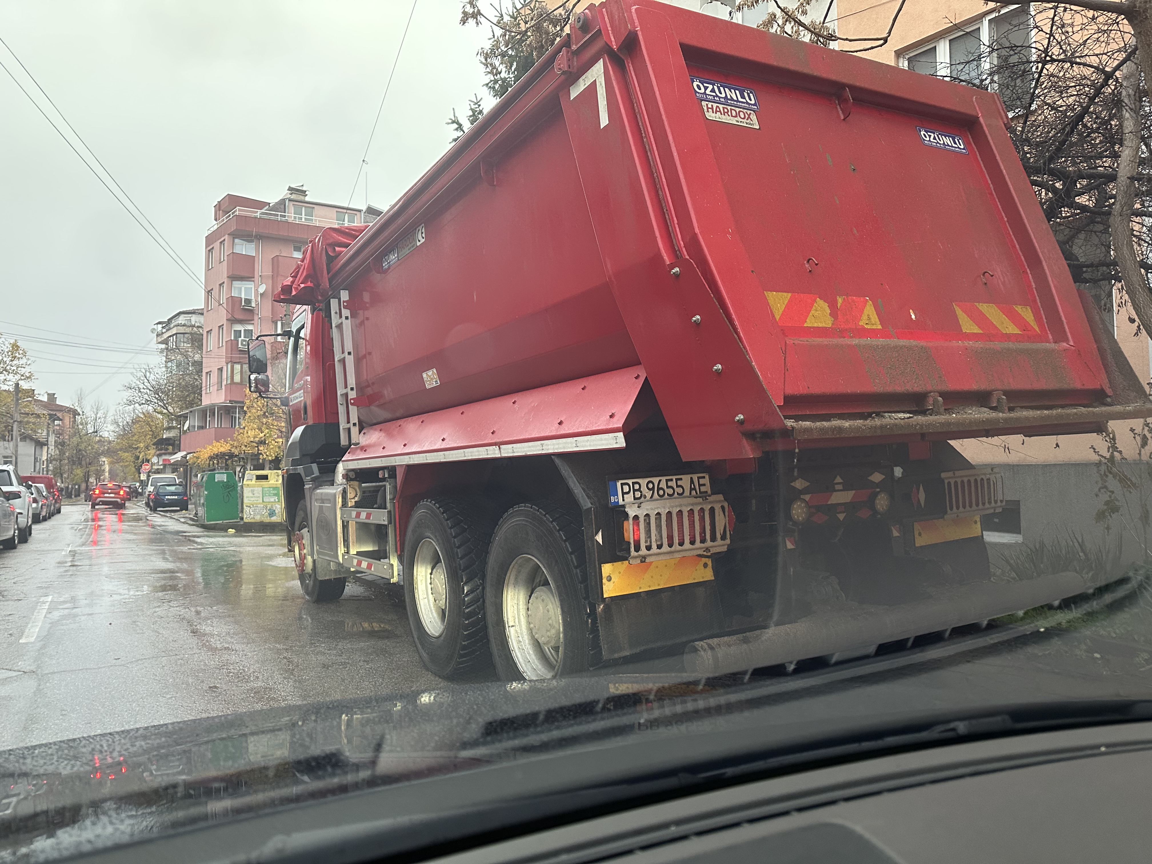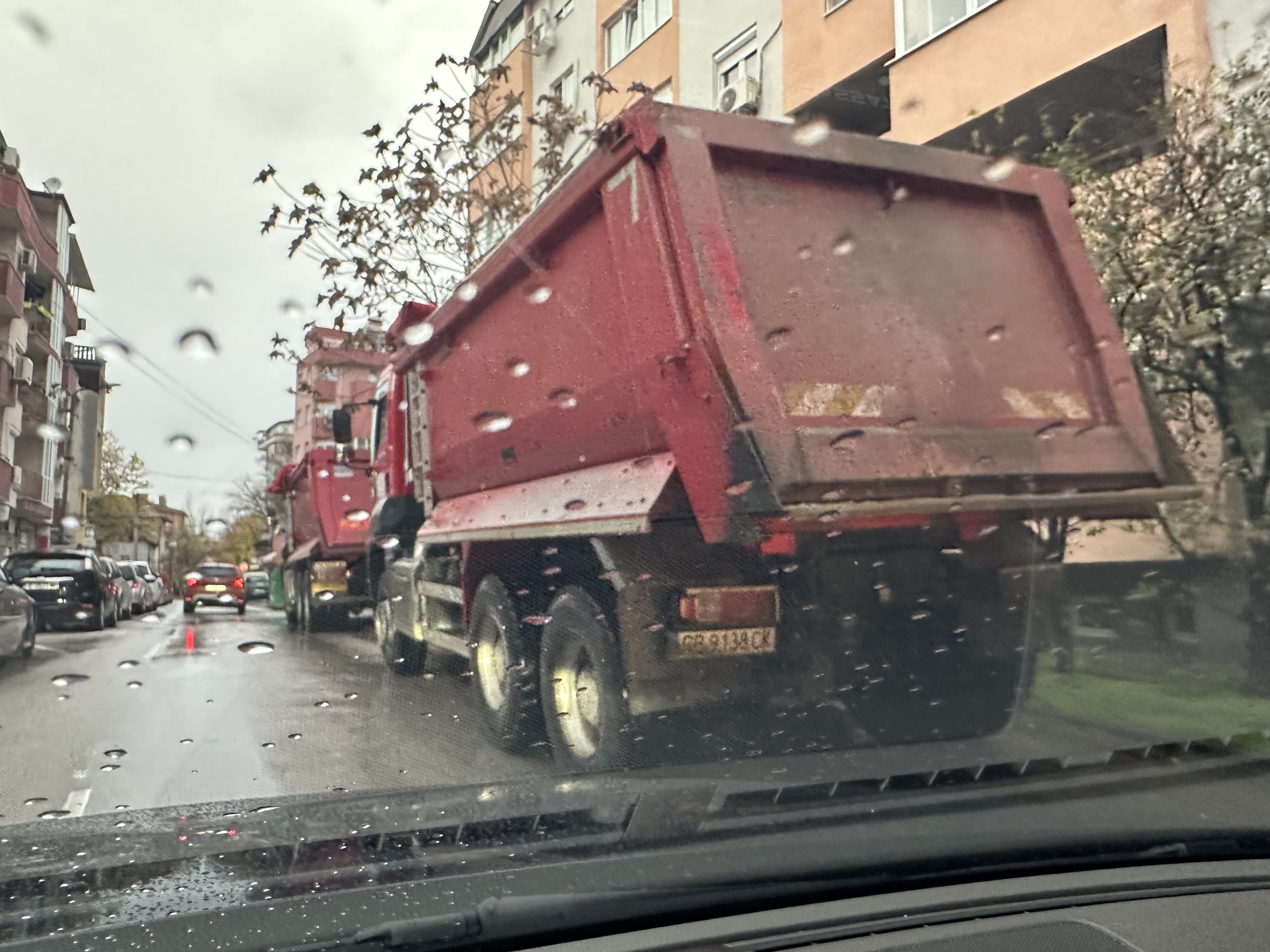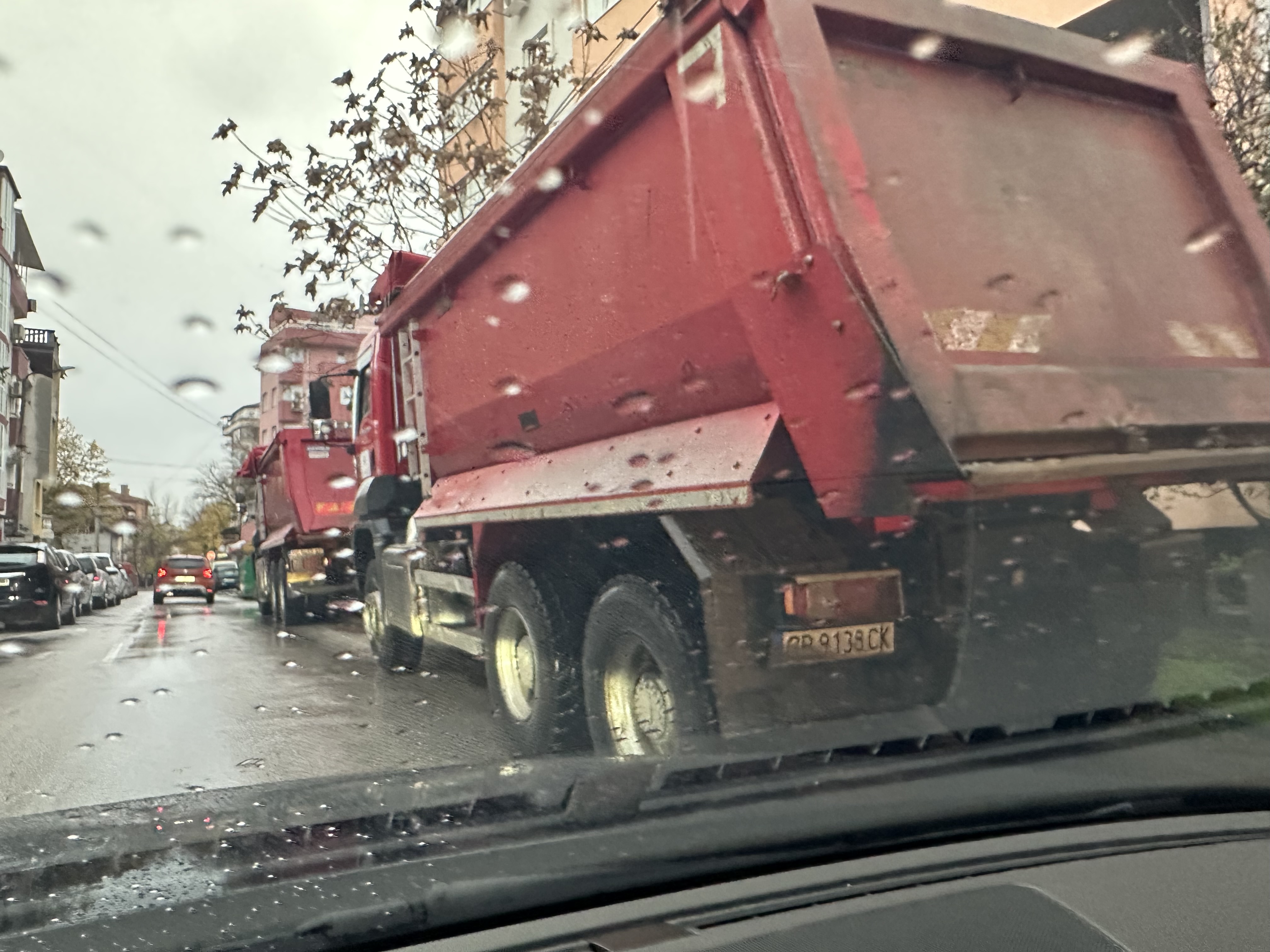 Неправилно паркиране на тежкотоварни строителни камиони върху тротоар