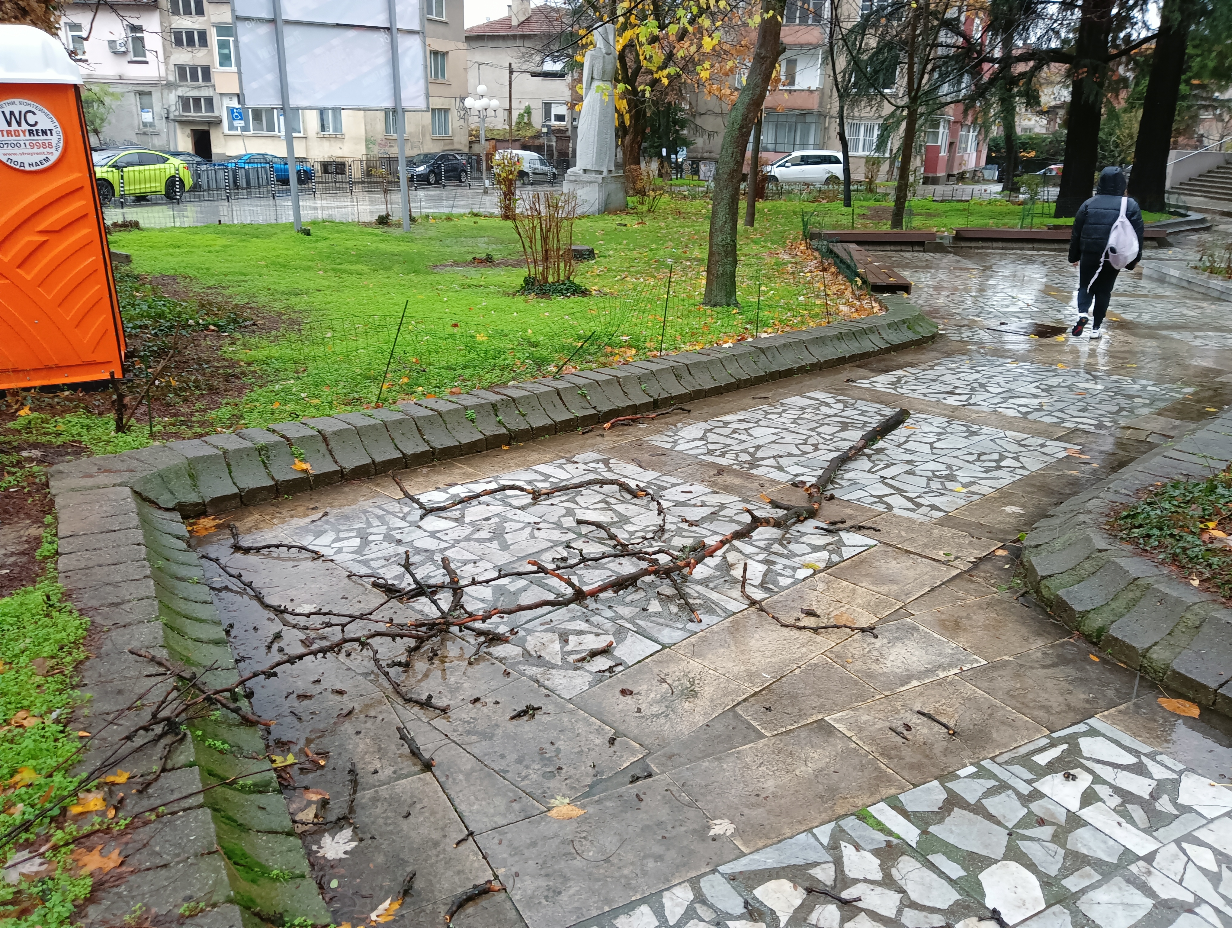 В резултат от продължителния валеж и вятъра се отчупи голям клон от дърво в градинката пред Националната хуманитарна гимназия. Друг по-голям клон е счупен, но все още стои заклещен между други клони във високата част на дървото. Под това дърво постоянно минават ежедневно стотици ученици, както и учители и родители на учениците първокласници от Второ ОУ, които провеждат все още занятията си в НХГ. Хубаво е бързо да се изпрати екип за оглед и отстраняване на изсъхналите клони във високата част на дървото.
