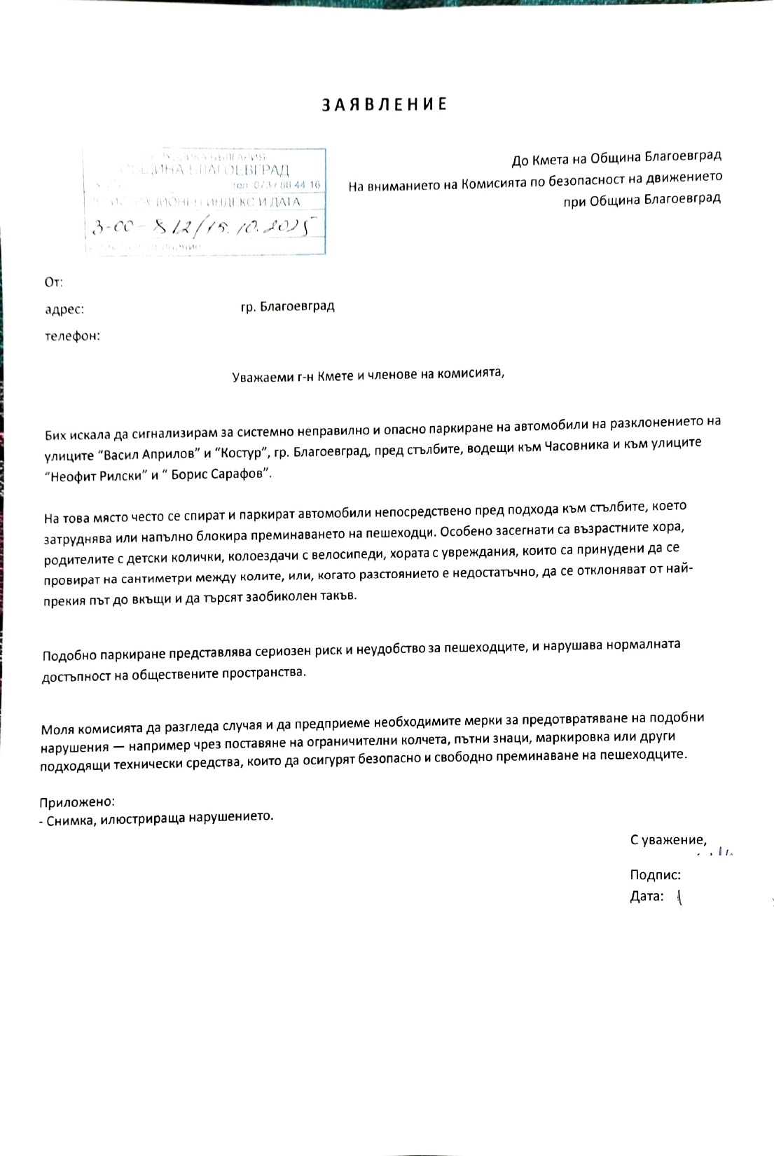 На 15.10.2025 входирах в деловодството на Общината заявление с номер 3-00-812 до г-н Кмета на Общината и на вниманието на Комисията по безопасност на движението. Тъй като всеки ден, особено в работно време, пред стълбите, водещи към Часовника, се паркира по безобразен начин, ви уверявам, че всеки ден ще ви подавам сигнал за това. Ето заповядайте снимки от ситуацията от тази сутрин, както и копие на заявлението ми от 15.10.2025.
