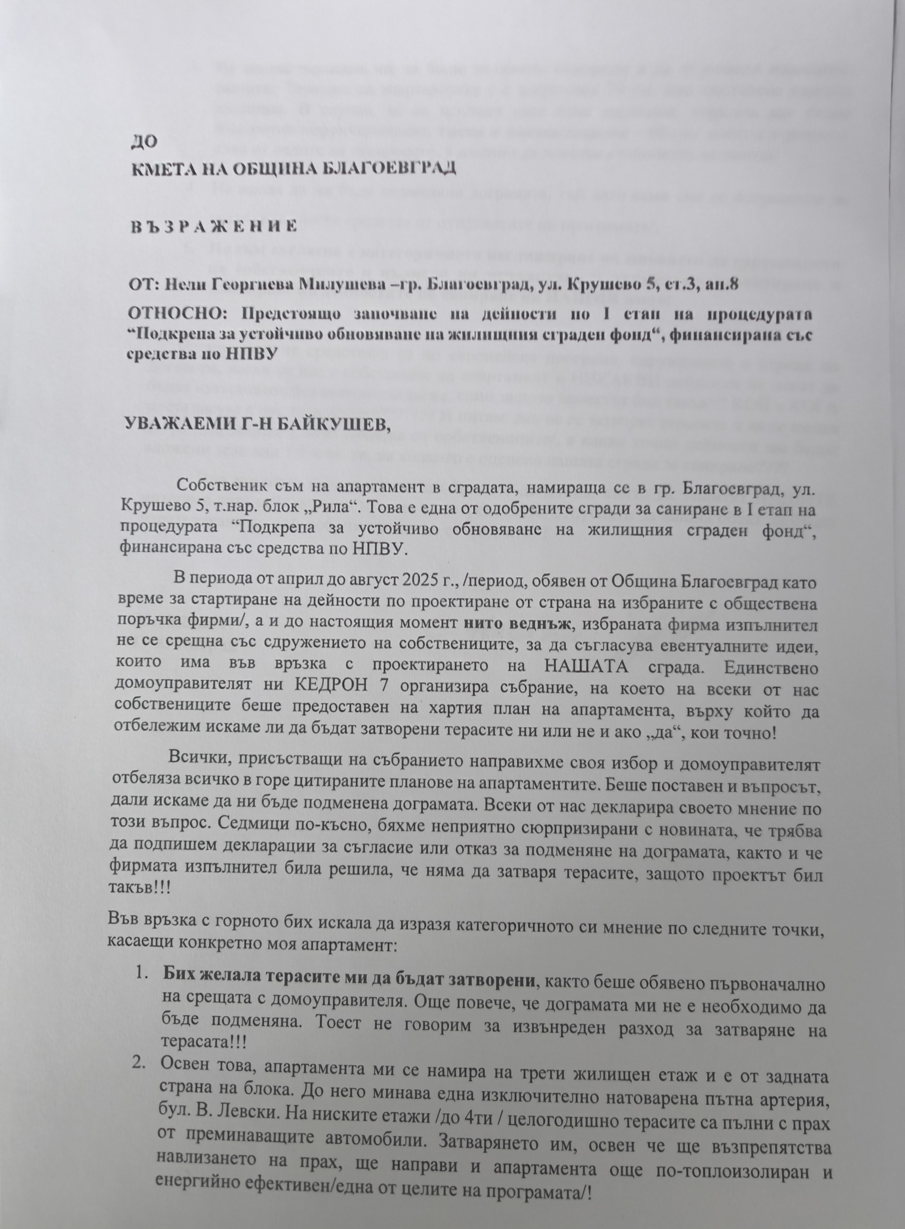 Възражение срещу предстоящи дейности по саниране на сградата
