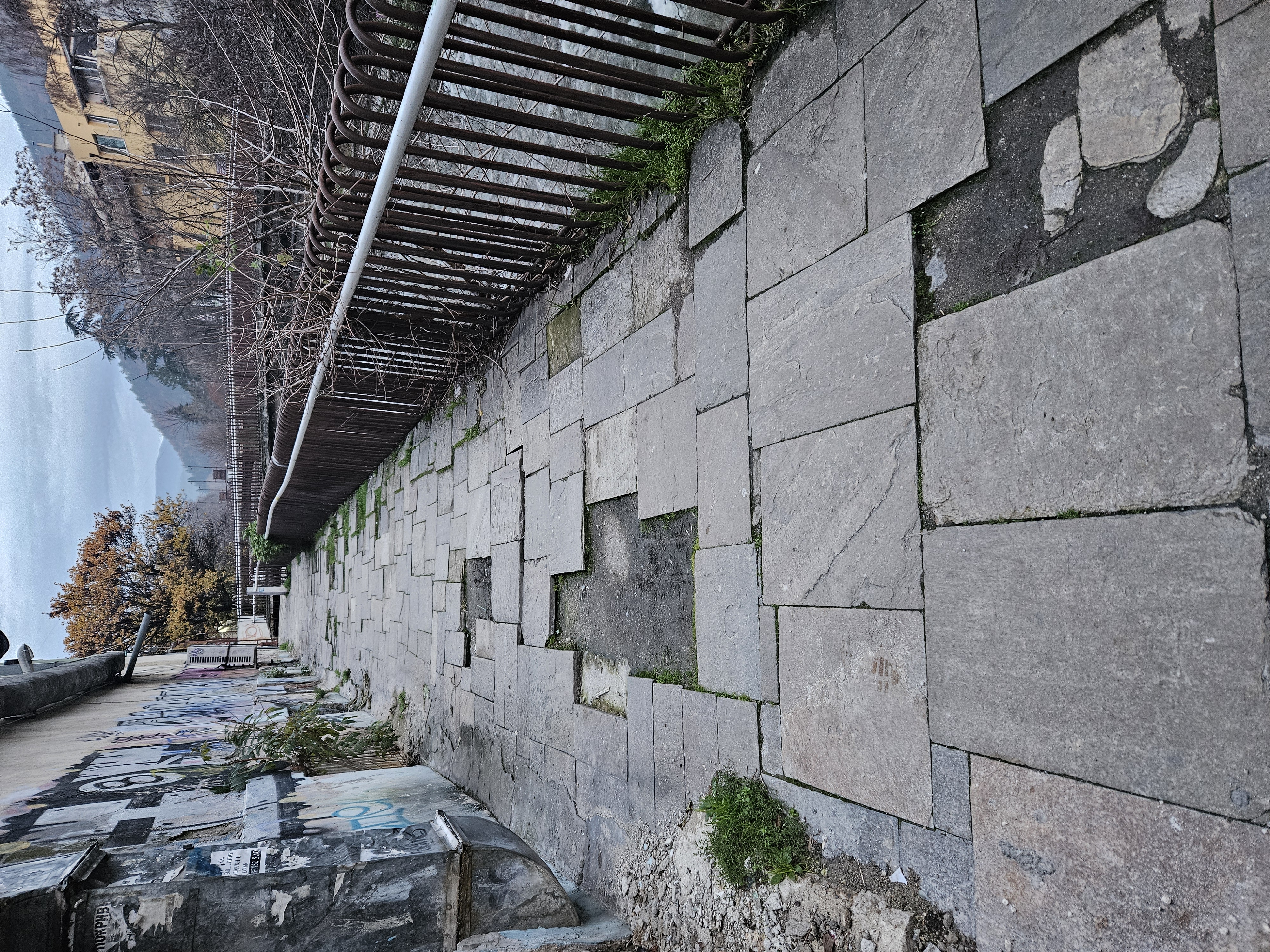 Целия тротоар ,мост до сградата е в дупки ,пълно с вода