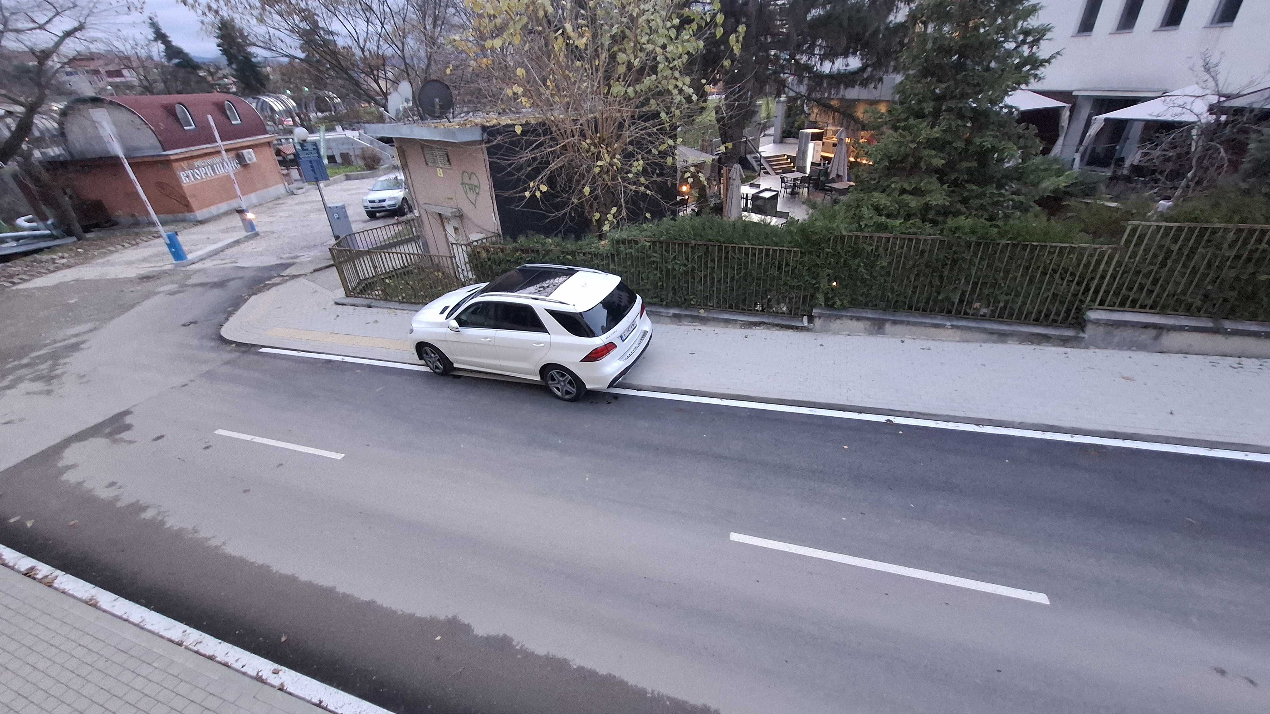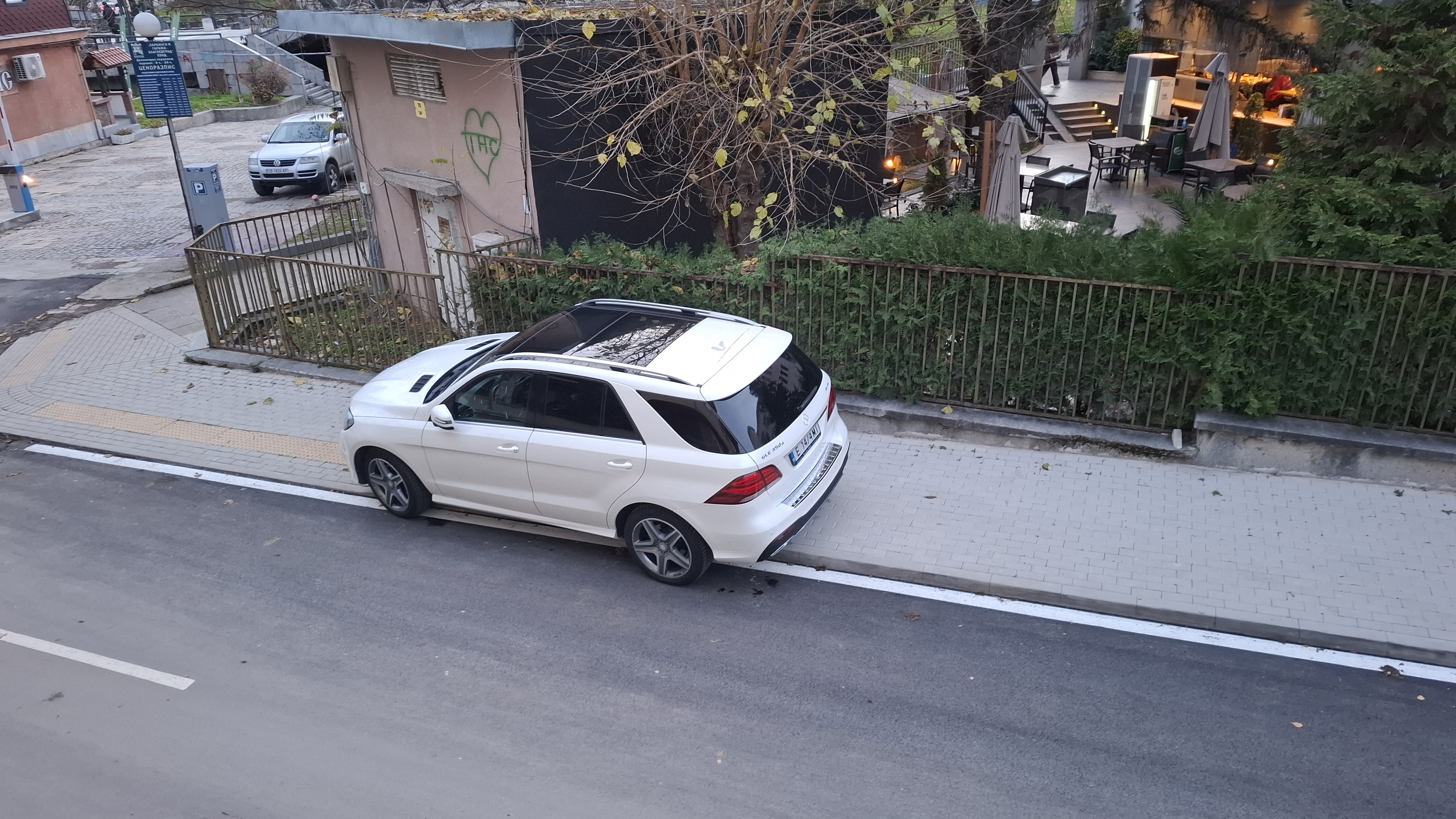 Автомобилът е паркиран изцяло върху тротоара/пешеходната зона, което възпрепятства свободното и безопасно преминаване на пешеходци, в частност хора с детски колички и хора с увреждания.