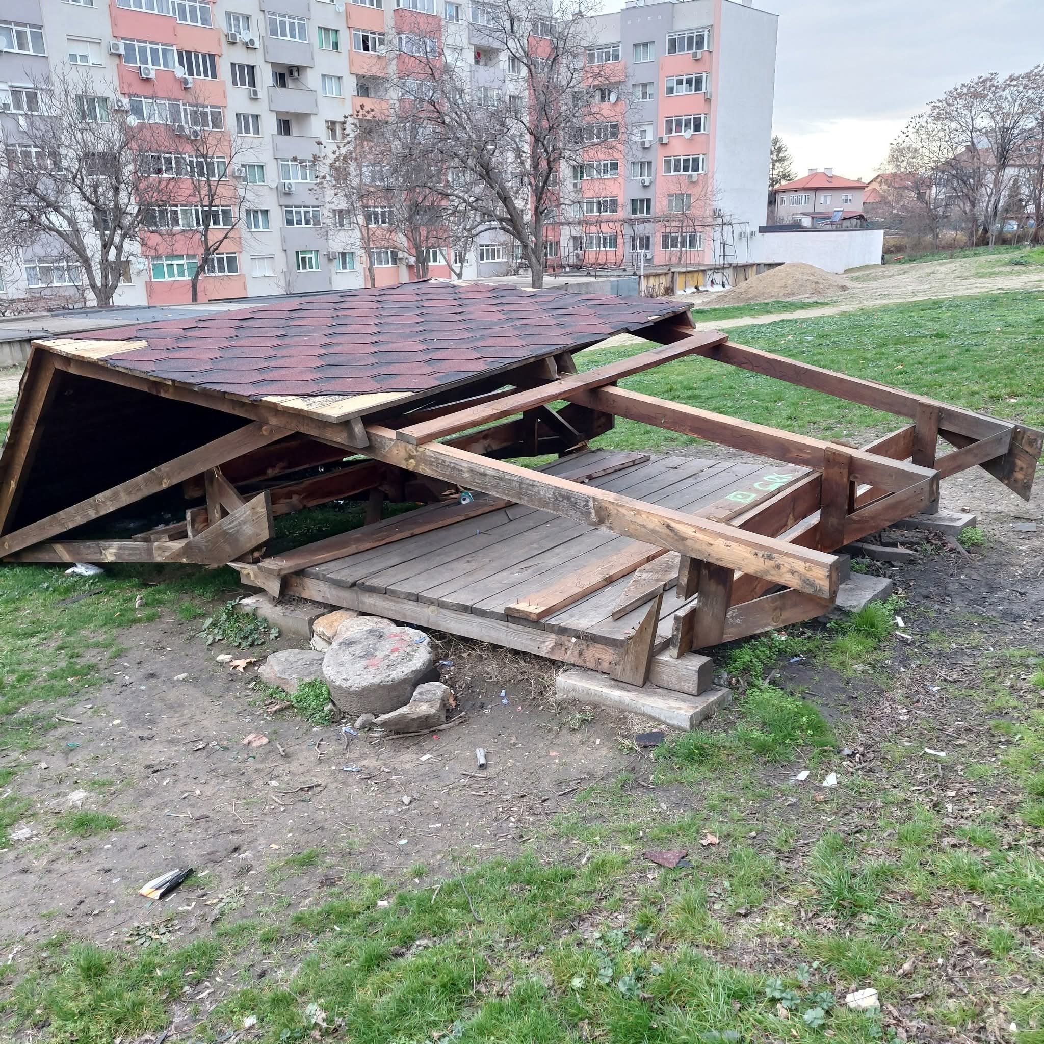 Беседката се намира в междублоковото пространство,което е предназначено по проект на общината за зелени части ,от една седмица е на земята цялата конструкция,стърчат пирони от нея и е опасна .уточнявам ,че в сигнал 105202 не ми е хванал точно адреса