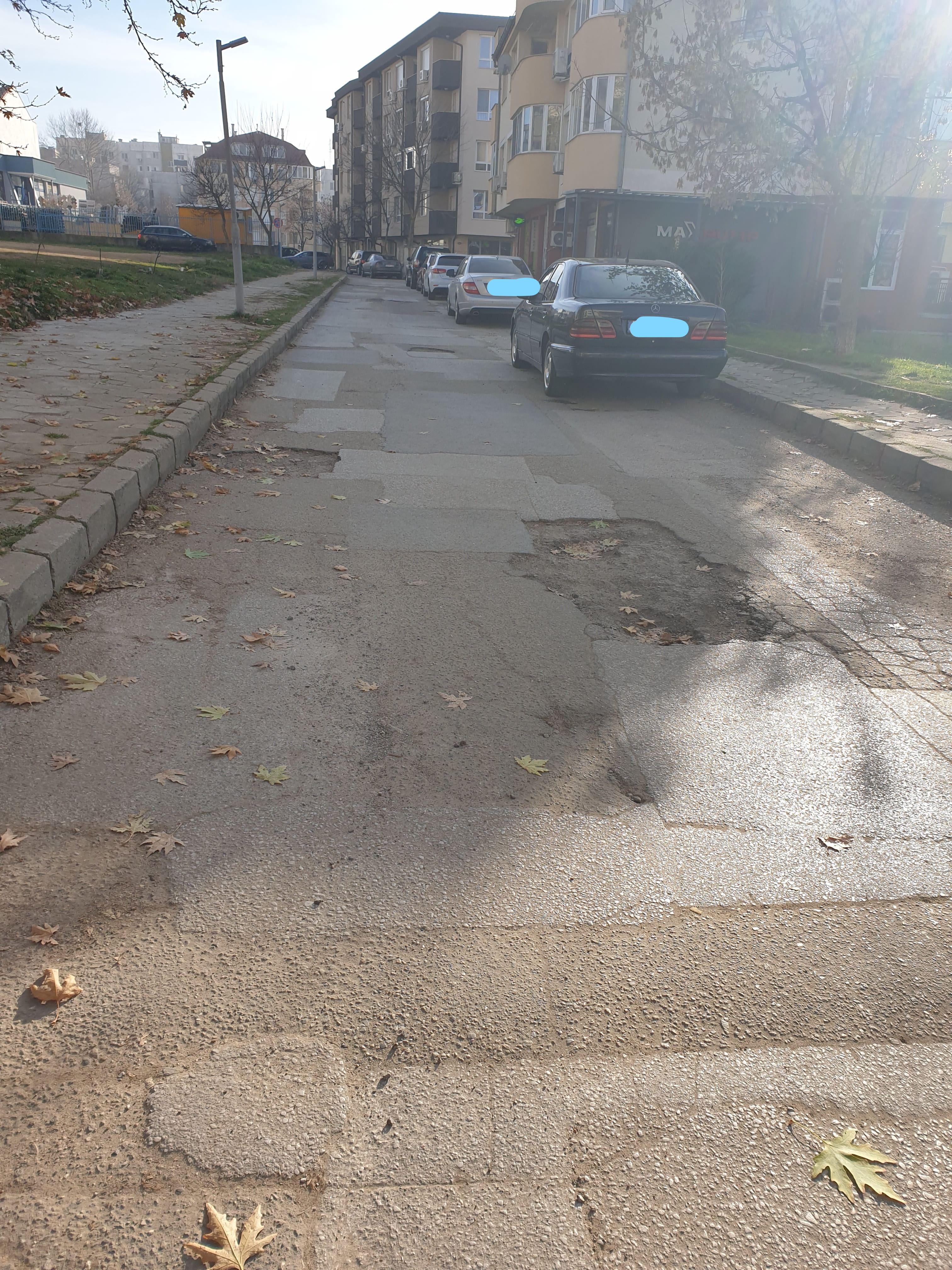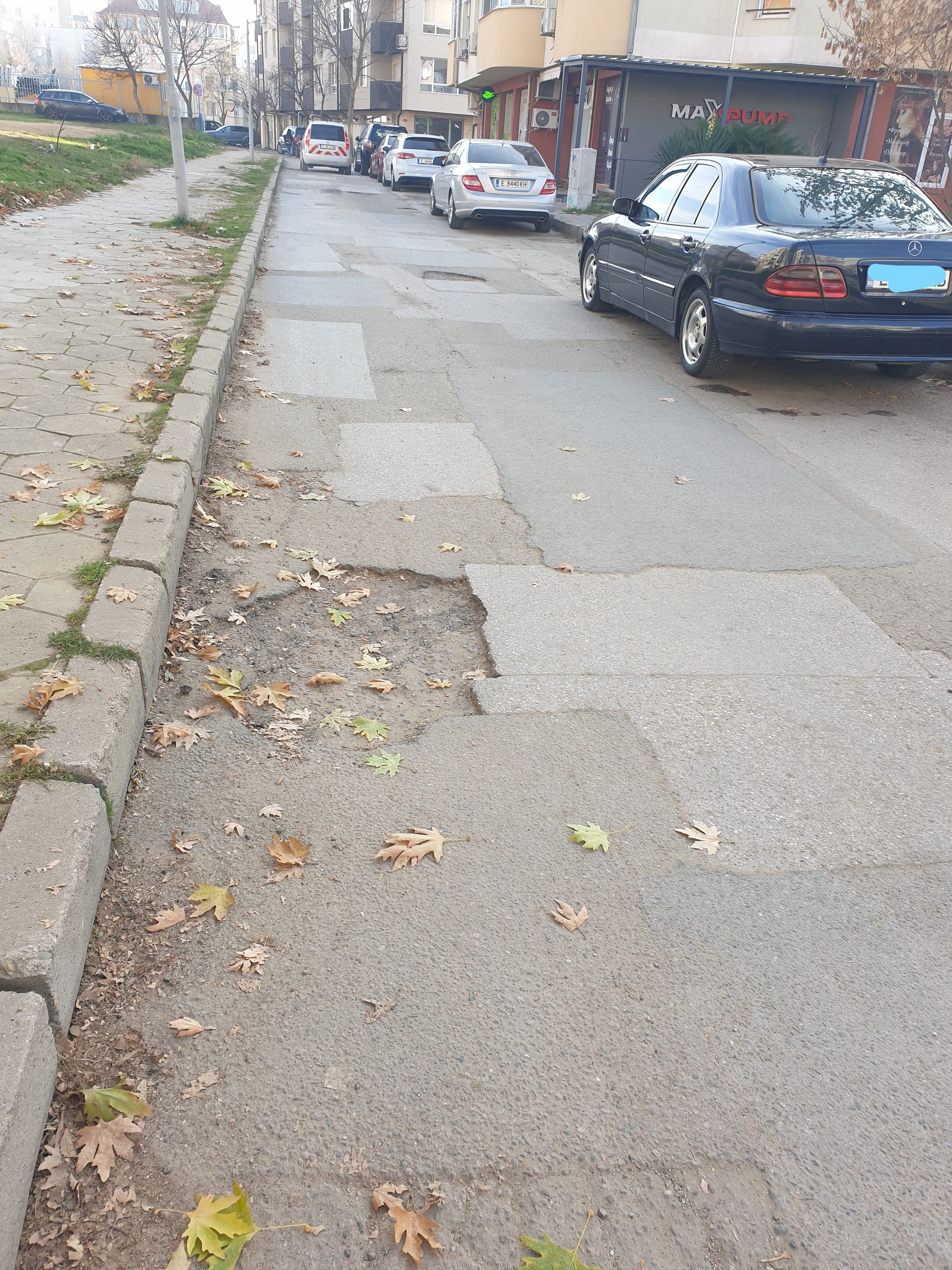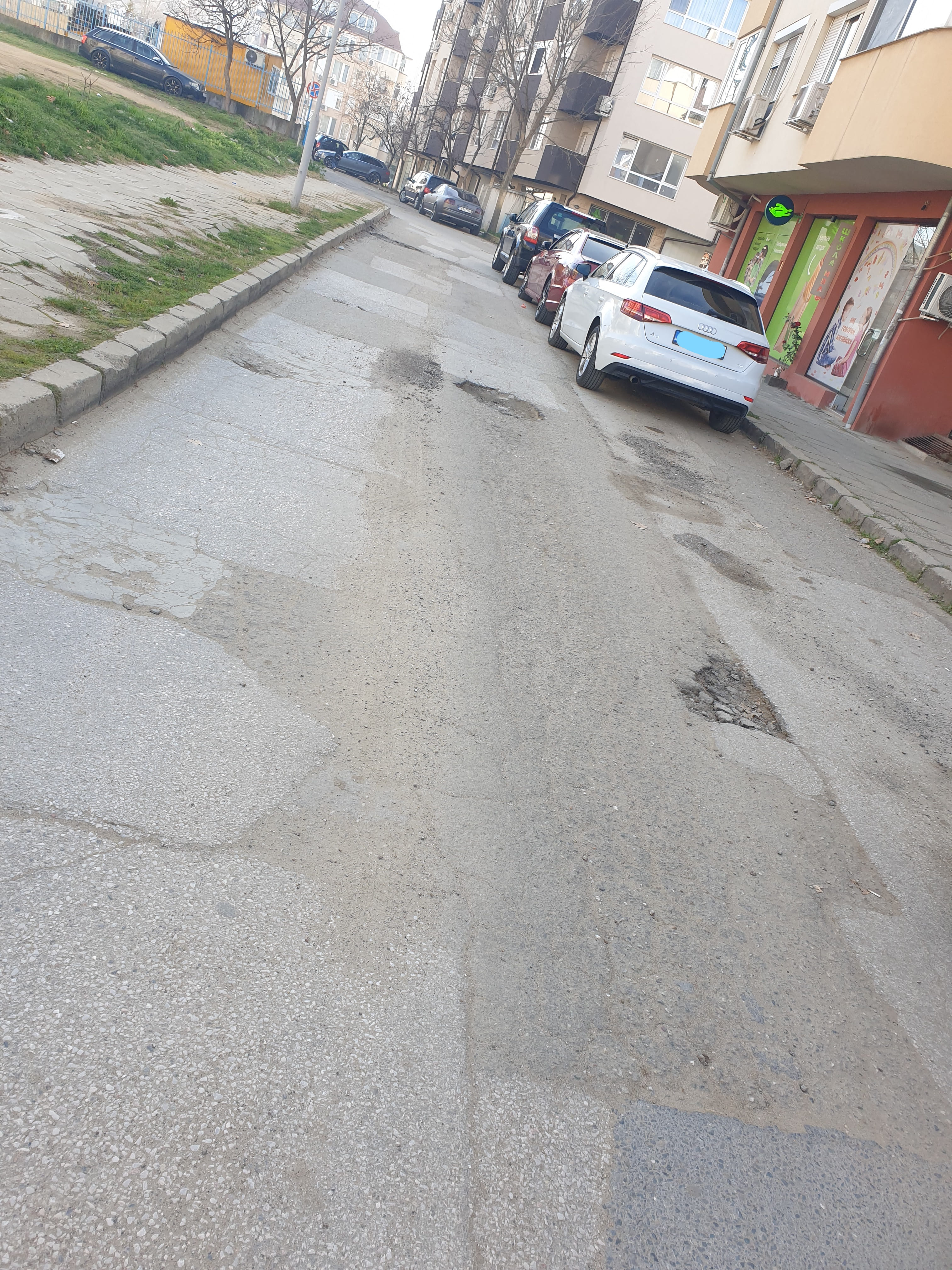 Здравейте, по ул. Орион - перпендикулярната на ул. Хан Омуртаг в Еленово, водеща към магазин Тонак всеки ден зейват все по-големи и дълбоки дупки, особено след последния дъжд преди дни. Понеже от едната страна на улицата има постоянно паркирали автомобили, особено след 13.00 часа до късна вечер, е невъзможно да се избегнат при преминаване. Големината е такава, че вече създават предпоставка за щета по джантите на автомобилите, особено при ниските. Независимо, че уличката е малка, тя е много натоварена, защото води към много жилищни кооперации и търговски обекти. Моля да се запълнят, защото при така компрометиран асфалт всеки ден и при валеж ще стават все по-големи и дълбоки. Не мисля, че изисква много усилия, а резултата ще ползваме всички граждани. Моля за своевременна реакция!