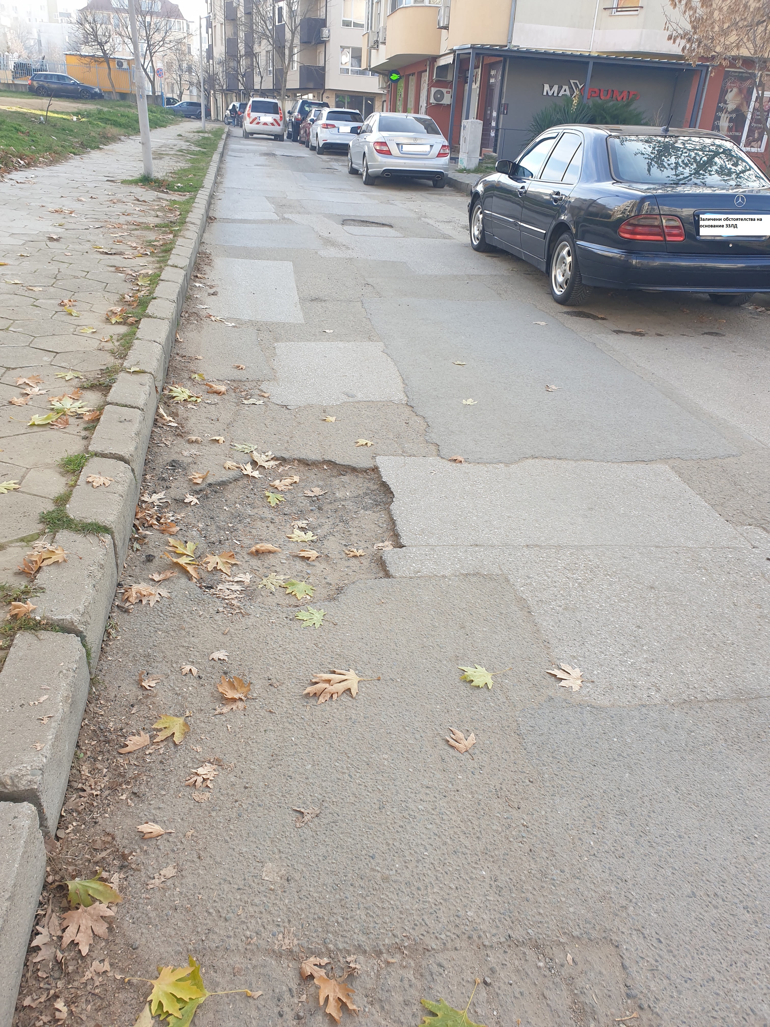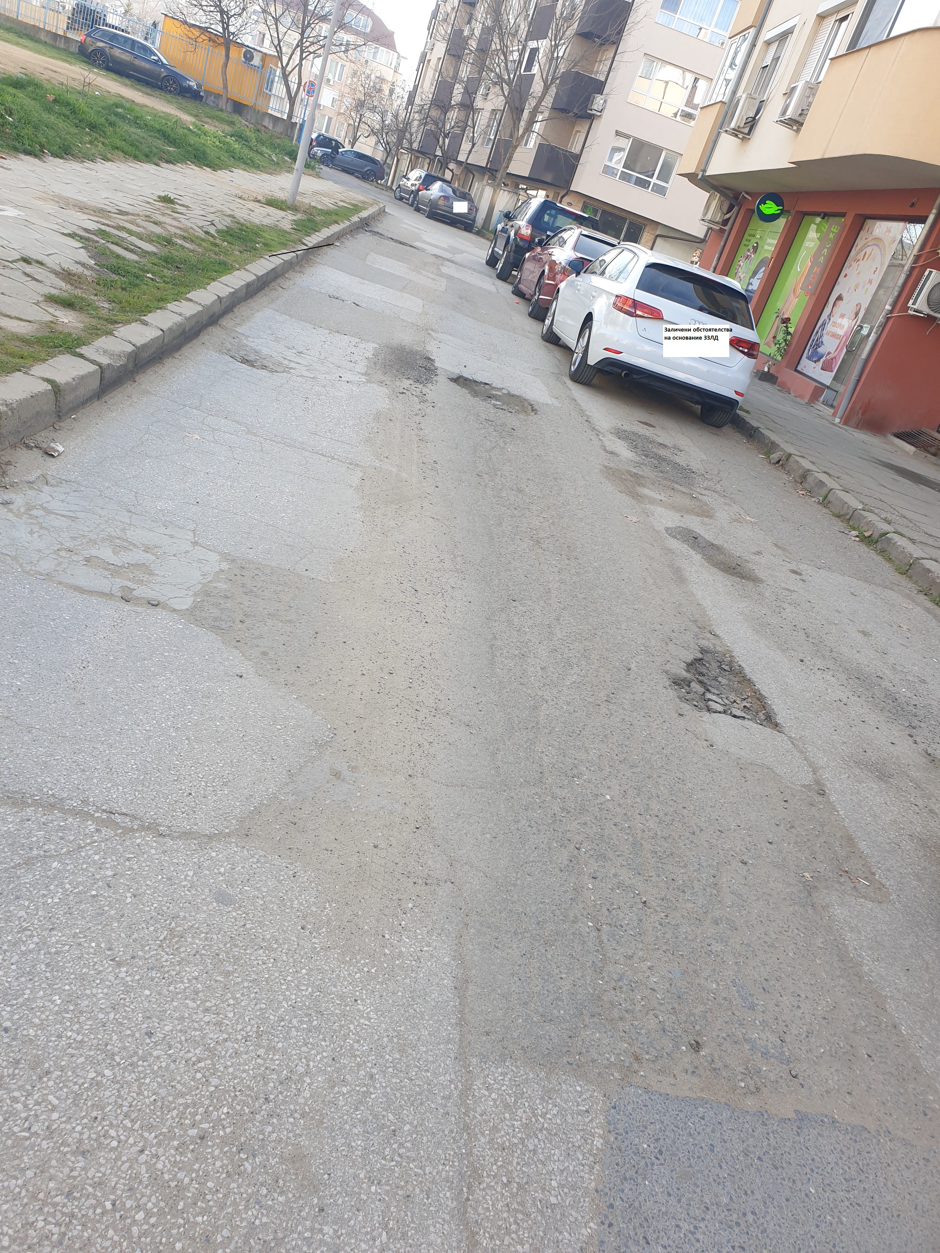 Здравейте, по ул. Орион - перпендикулярната на ул. Хан Омуртаг в Еленово, водеща към магазин Тонак всеки ден зейват все по-големи и дълбоки дупки, особено след последния дъжд преди дни. Понеже от едната страна на улицата има постоянно паркирали автомобили, особено след 13.00 часа до късна вечер, е невъзможно да се избегнат при преминаване. Големината е такава, че вече създават предпоставка за щета по джантите на автомобилите, особено при ниските. Независимо, че уличката е малка, тя е много натоварена, защото води към много жилищни кооперации и търговски обекти. Моля да се запълнят, защото при така компрометиран асфалт всеки ден и при валеж ще стават все по-големи и дълбоки. Не мисля, че изисква много усилия, а резултата ще ползваме всички граждани. Моля за своевременна реакция!"