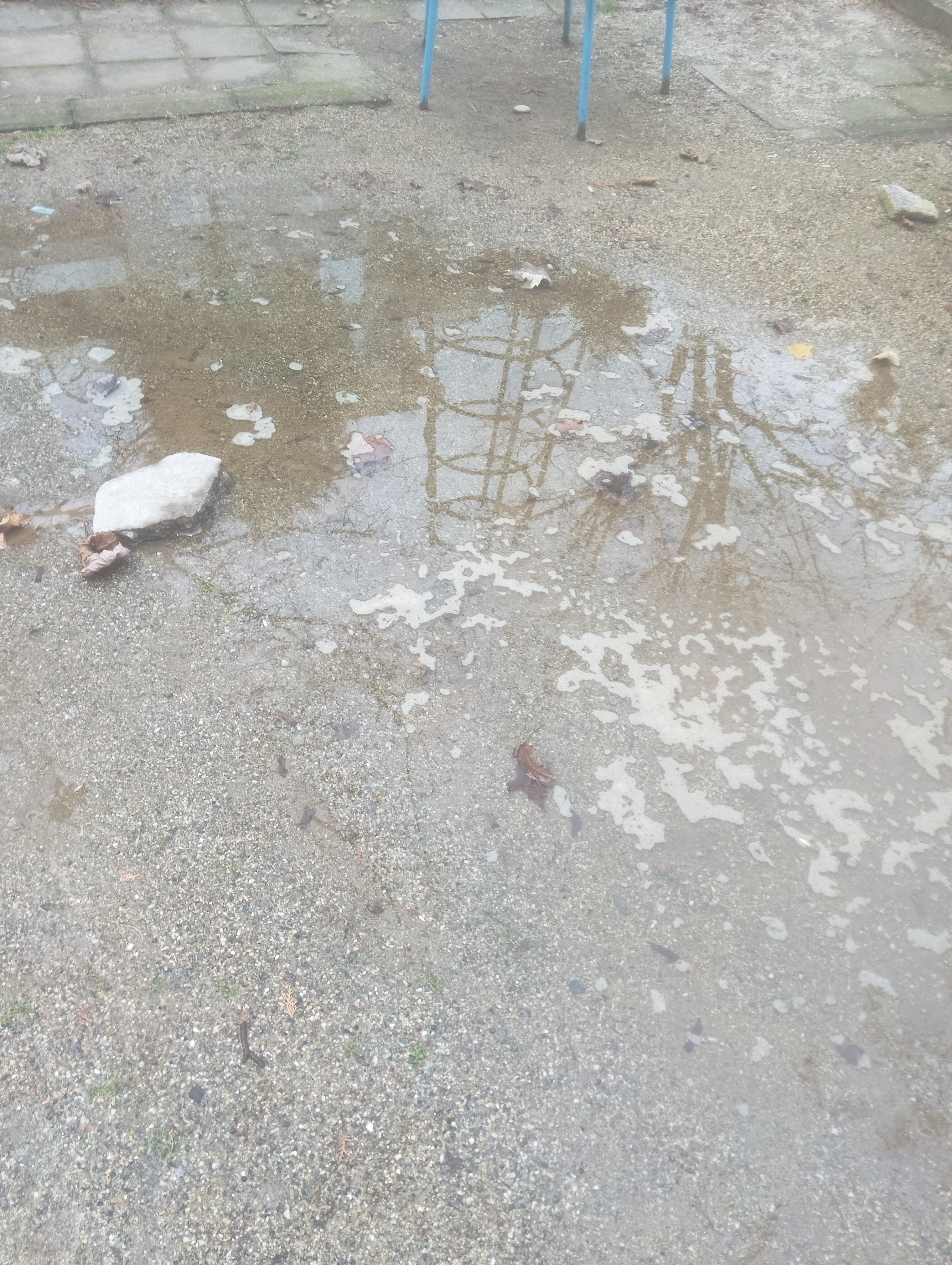 На спортната детска площадка, прилежаща към блок и детска градина, находища се пред бл. 107 Б в ж.к. "Еленово" има спукана ВиК тръба, поради която настилката от пясък потъва, а водата извира.