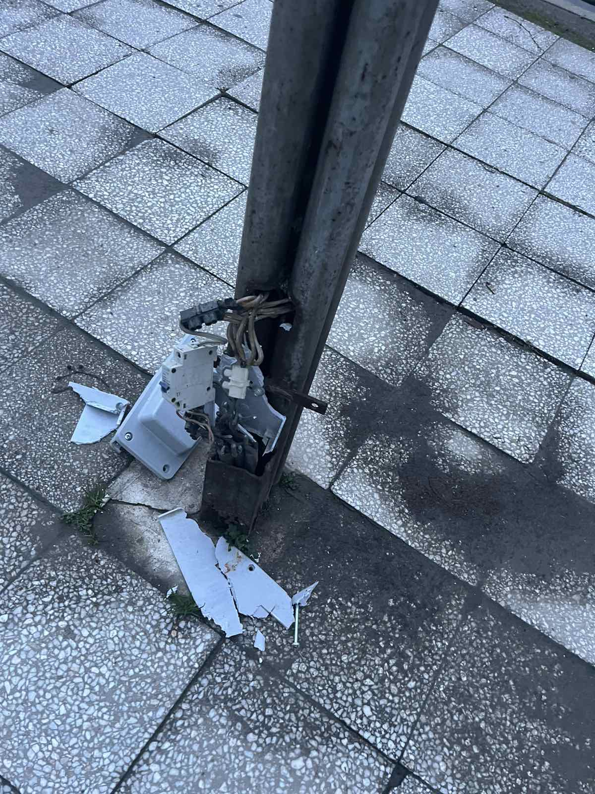 На площада, пред паметника на Кирил и Методий има улична лампа, която свети, но кутията на захранването й е разбито, има стърчащи кабели.