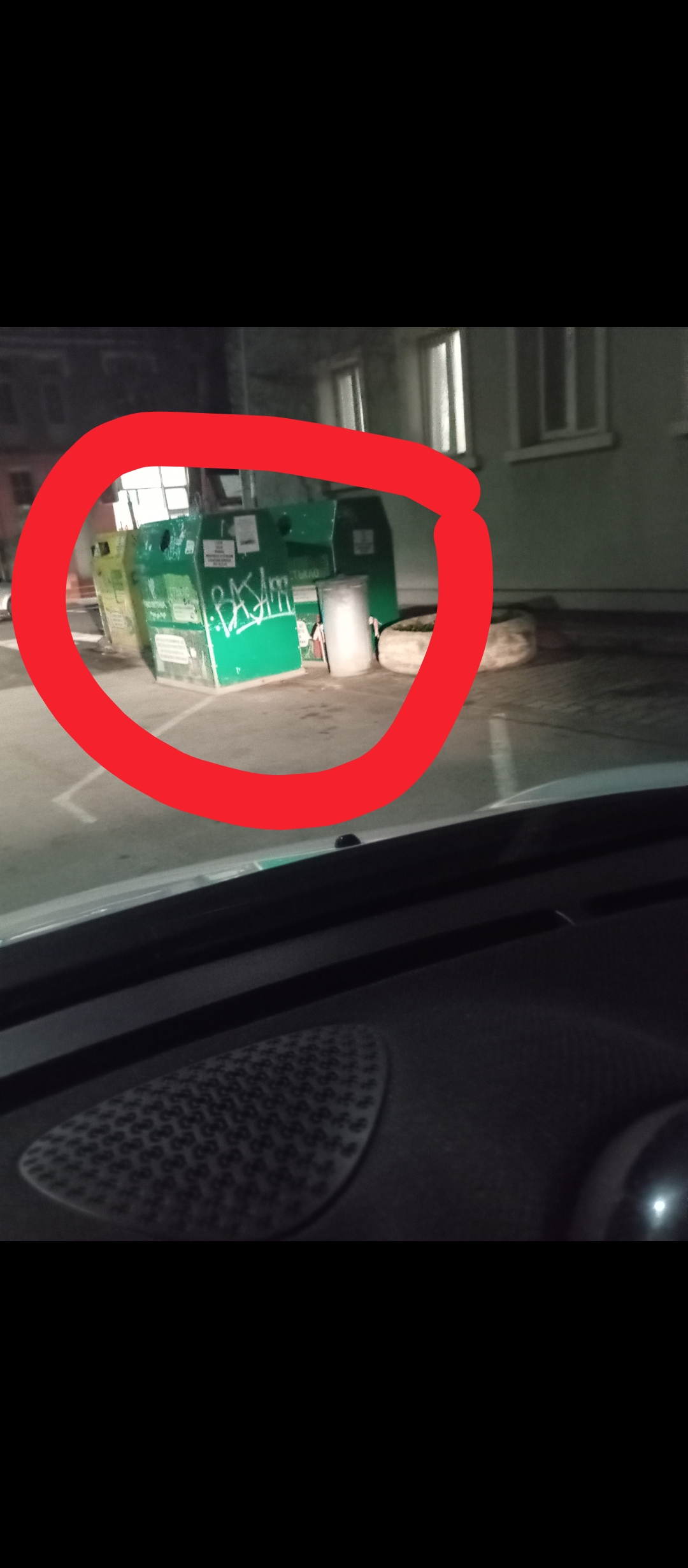 Зад банята има един зелен кош за отпадаци, който заема цяло паркомясто, трябва да се премести, за да се освободи това място