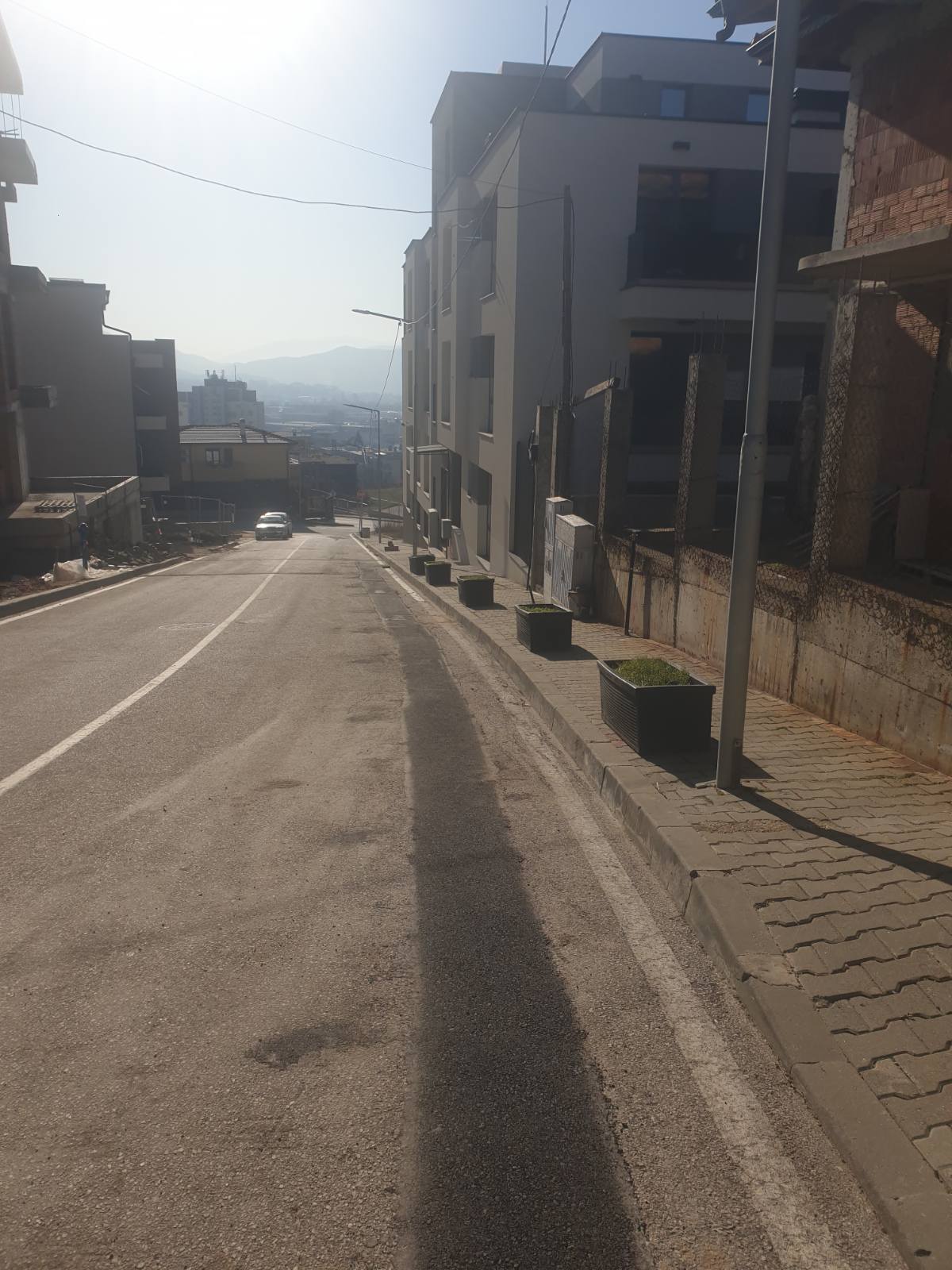 Собственика на недостроената къща се опитва да предотврати паркиране на автомобили чрез саксиите, които сваля от тротоара на пътя.
