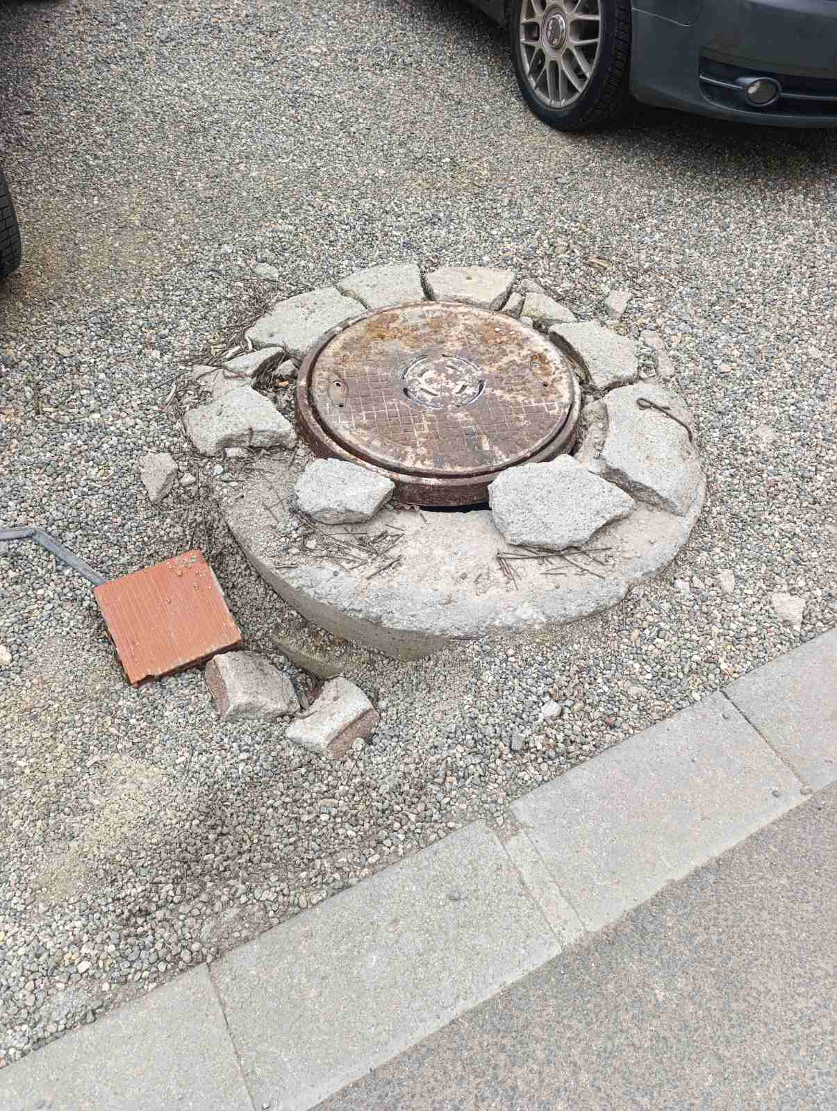 На ново изградения паркинг има шахта, на която капакът е разбит и има опасност някой автомобил да го отмести и да падне.