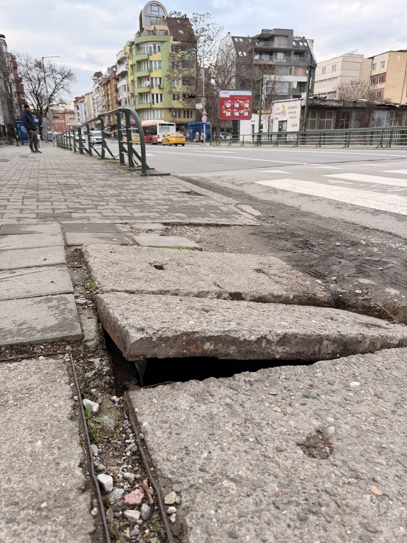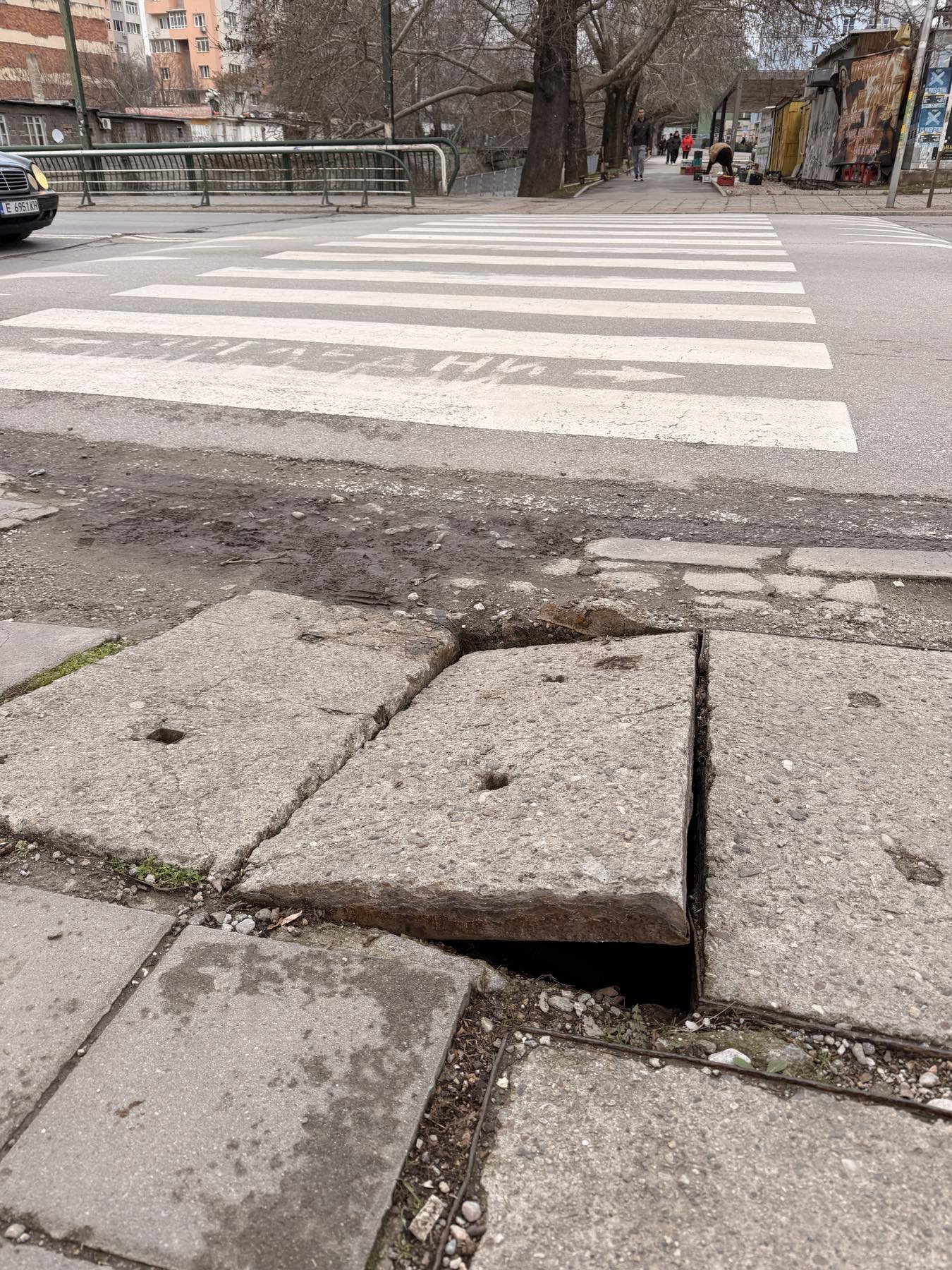 Точно до моста над реката на бул. Джеймс Баучер, след пешеходната пътека от страната на Американските общежития има много опасна шахта. Моля, вземете мерки!