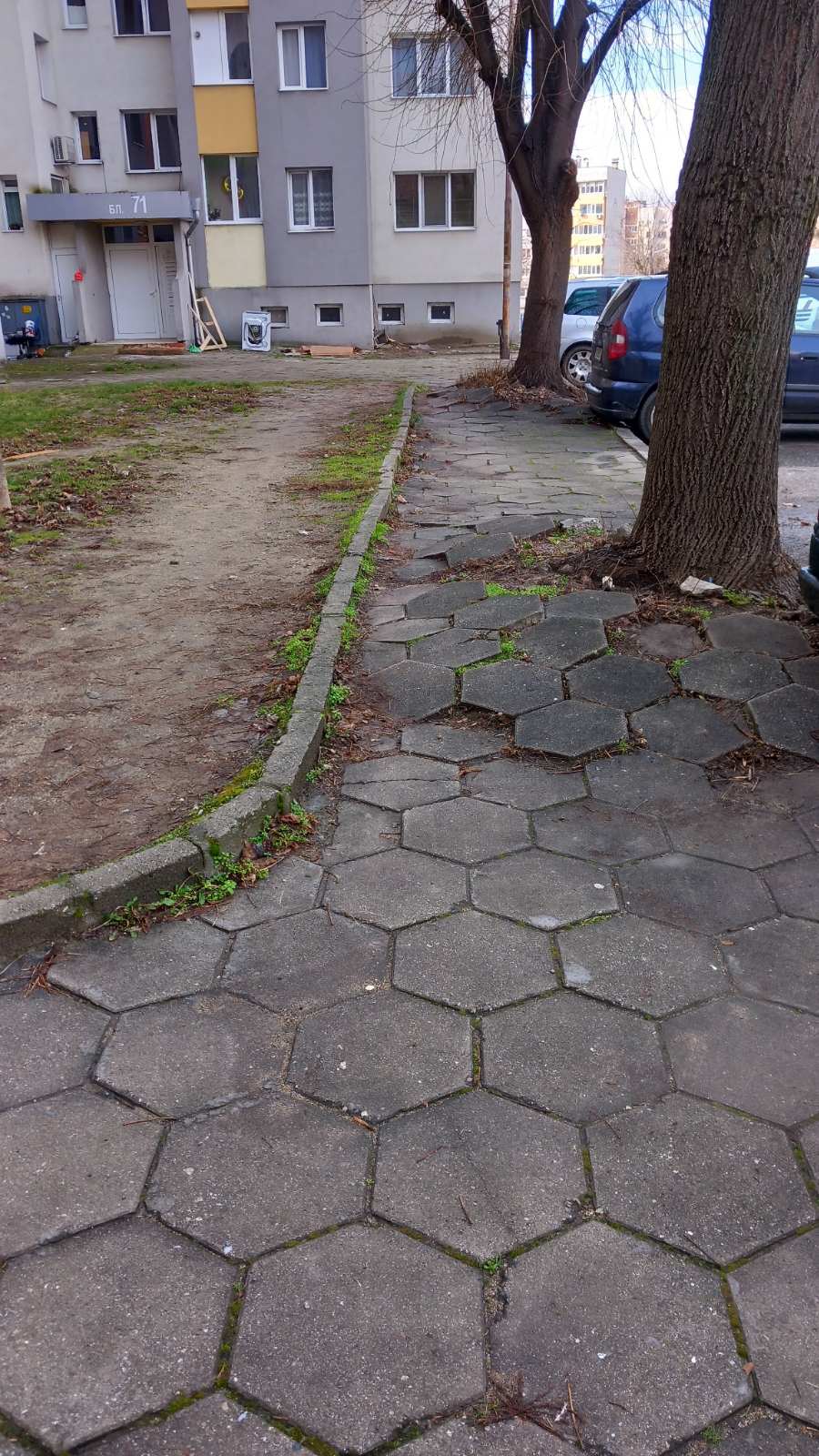 Преминаването по тротоара е силно затруднено заради разрасналата се липа пред блоковете. Моля алеята да бъде разширена с още 2–3 тротоарни плочки, за да се осигури нормален достъп за пешеходците. Надяваме се проблемът да бъде решен в най‑кратък срок.