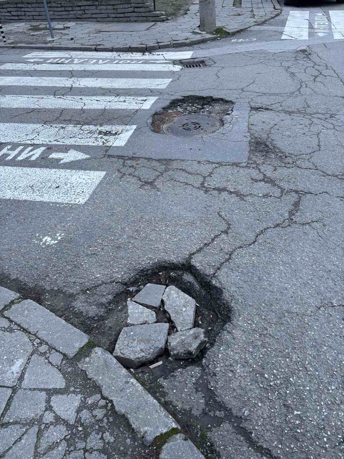 На пътното платно срещу входа на двора на VII СУ има три пропаднали шахти в непосредствена близост една до друга, възпрепятстващи плавно преминаване и/или разминаване на два автомобила без пропадане в дупка.