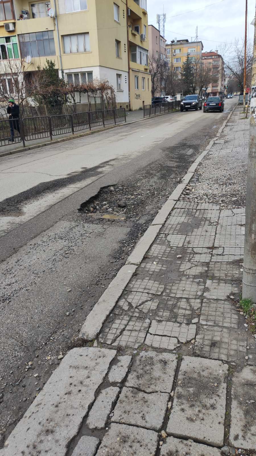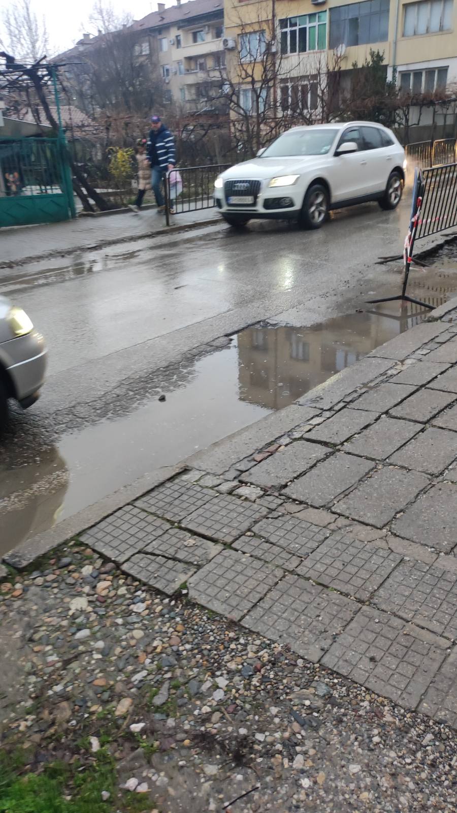 От няколко седмици седи тази дупка и се увеличава след всеки проливен дъжд. С поставянето на тези ограждения трафика сутрин е ужасен. Да не говорим, че и от другата страна срещу огражденията се появява нова дупка, която също след всеки дъжд расте, както ще видите на снимките. Искам да ви попитам и там ли ще се огради по същия начин и така ли се решават проблемите като поставяме оградки, а не вземем адекватни мерки. Цялата улица е за ремонт. Моля този проблем да се реши по най-добрия начин, тъй като отдам всеки ден минават много ученици и не е безопасно за тях, а да не говорим, че при един дъжд отиват винаги мокри, тъй като се образуват "реки". Надявам се, че този път проблема ще оправи.