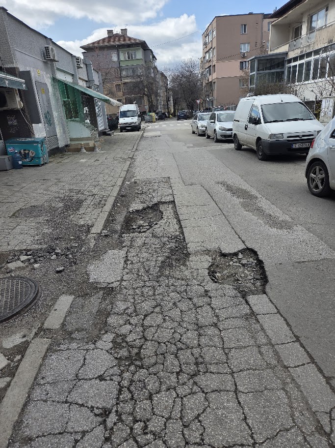 Посочената улица е силно натоварена, а отделни участъци не са ремонтирани от години. Настилката е в крайно лошо състояние – налични са множество дълбоки и опасни дупки, които създават реален риск от произшествия, увреждане на автомобили и затрудняват нормалното преминаване.