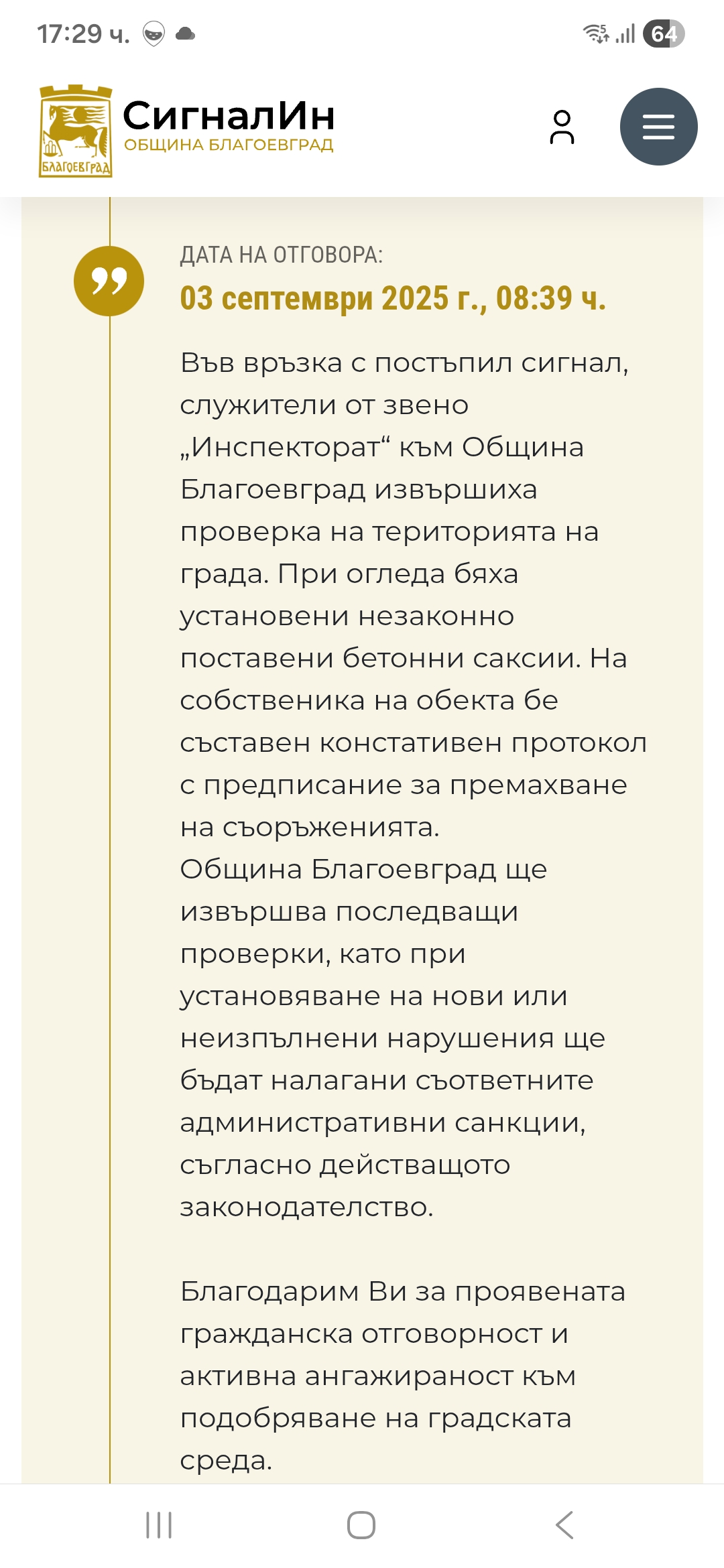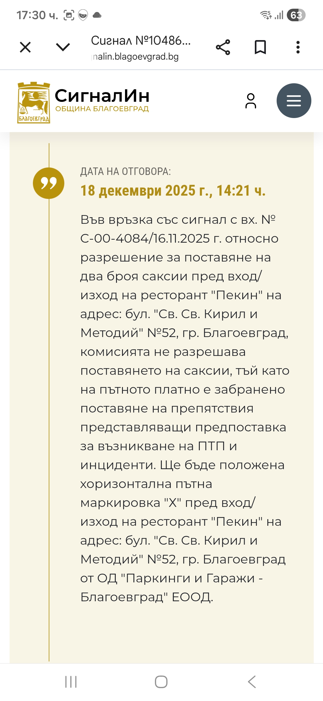 Трети пореден сигнал подавам относно бетонови саксии при входа на китайски ресторант Пекин, изградени върху общинска собственост!!! Прилагам снимки с отговор от предишни сигнали с номера #103748 и #104862, както и снимка към днешна дата. Питам се, работят ли институциите отговорни за това? Да разбирам ли, че всеки може да си прави подобни заграждения, без да носи отговорност за това???