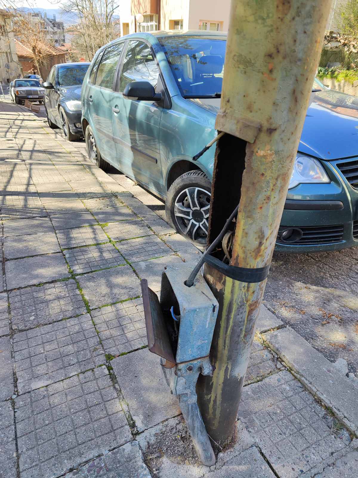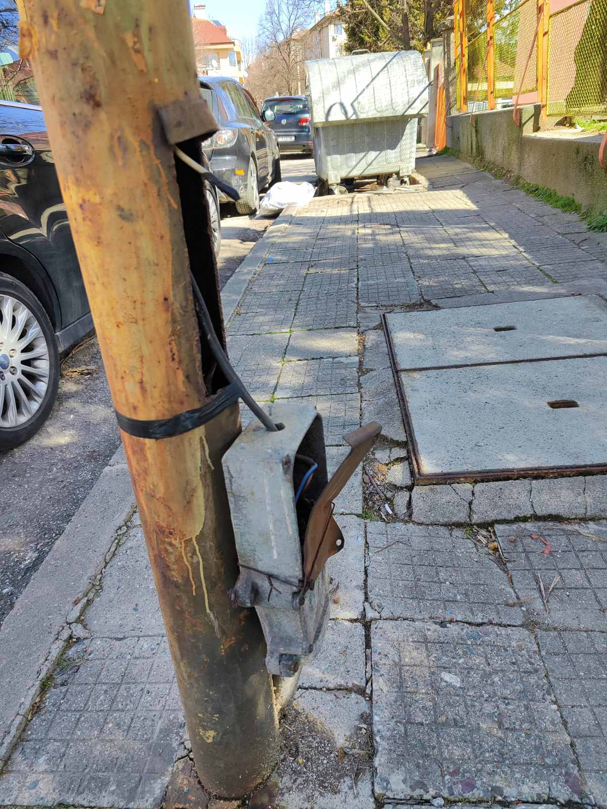 Прилагам снимки на безобразно изглеждащ и потенциално опасен стълб в близост до детска градина.