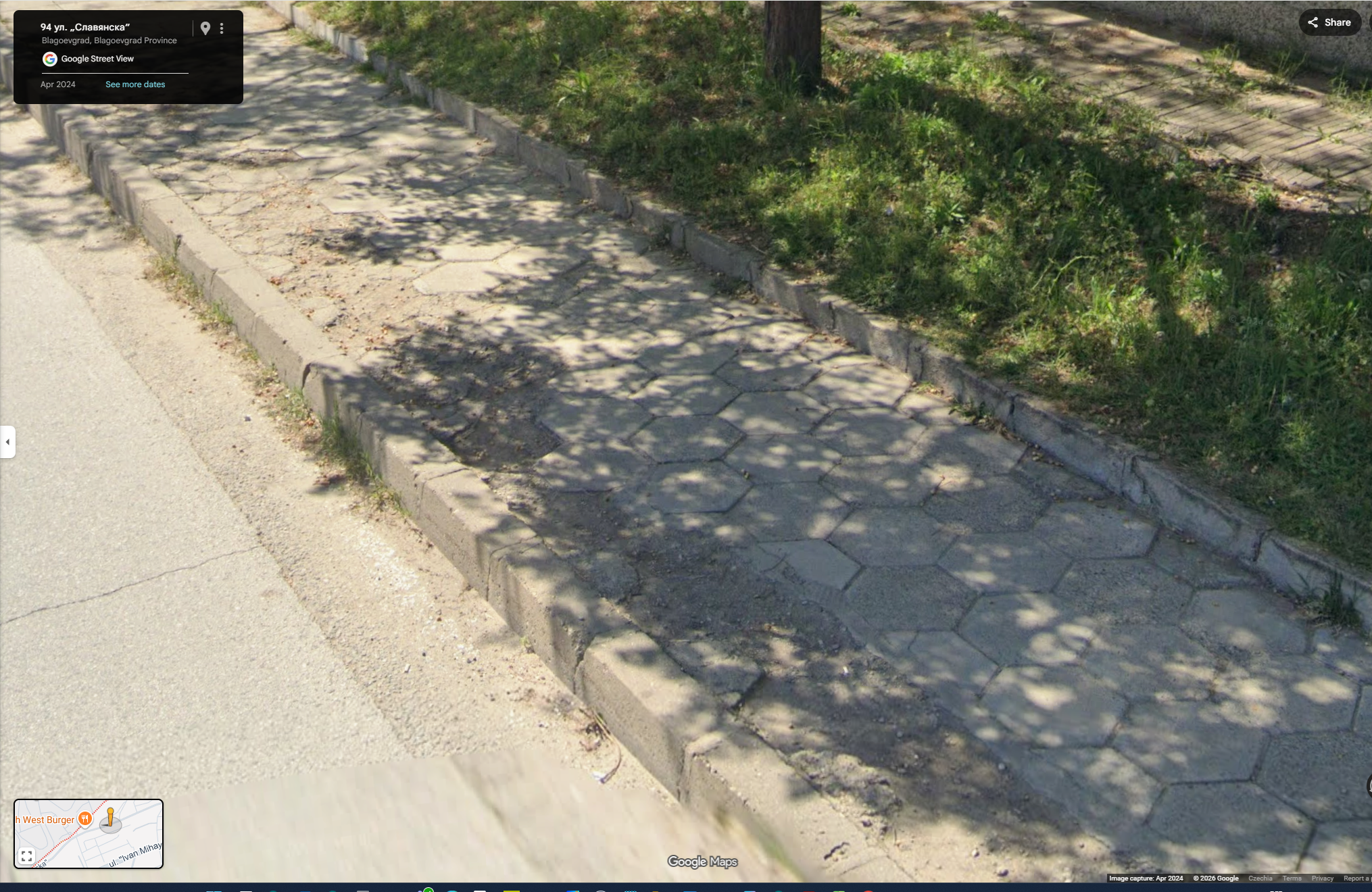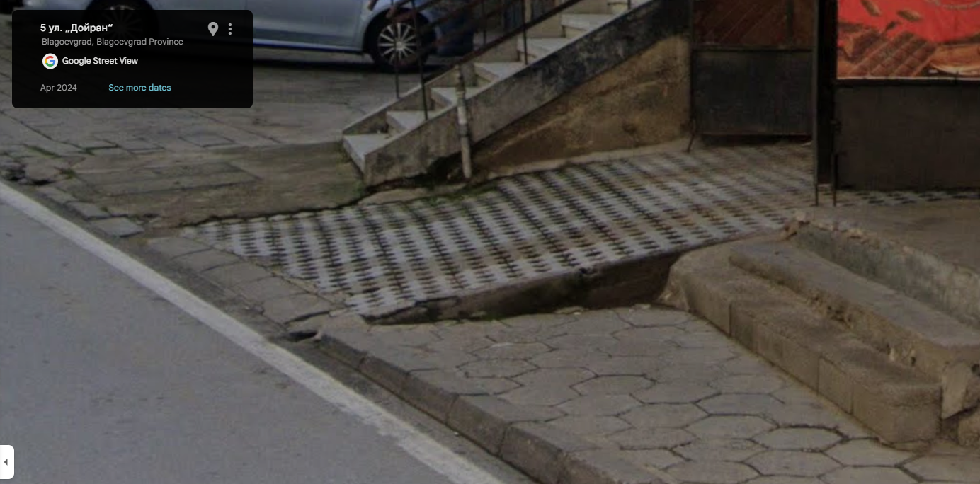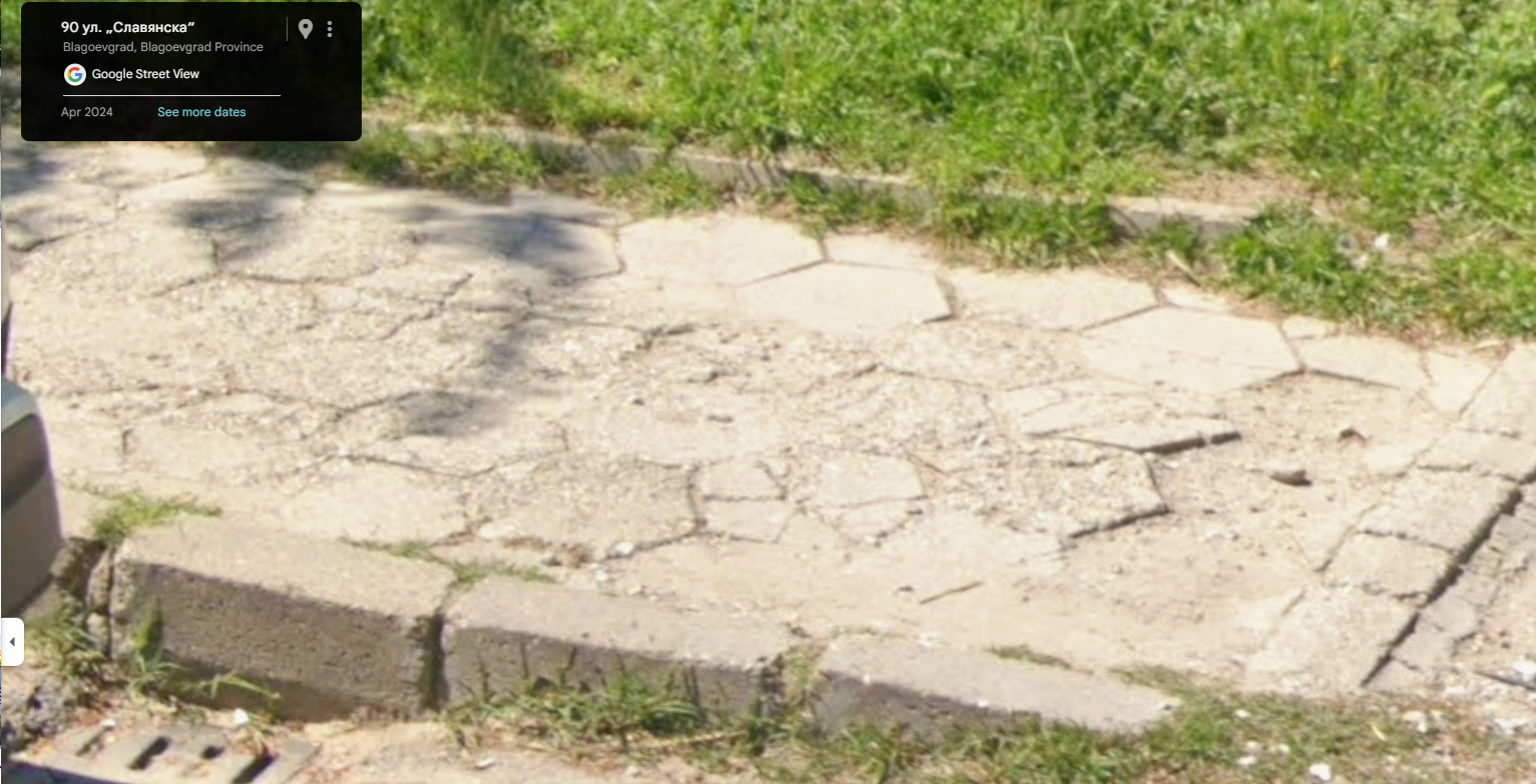 Тротоарната настилка около светофара на ул. „Дойран“ и ул. „Славянска“ е силно компрометирана – има счупени и липсващи плочки, което затруднява преминаването на майки с бебешки колички, велосипедисти и трудноподвижни граждани.