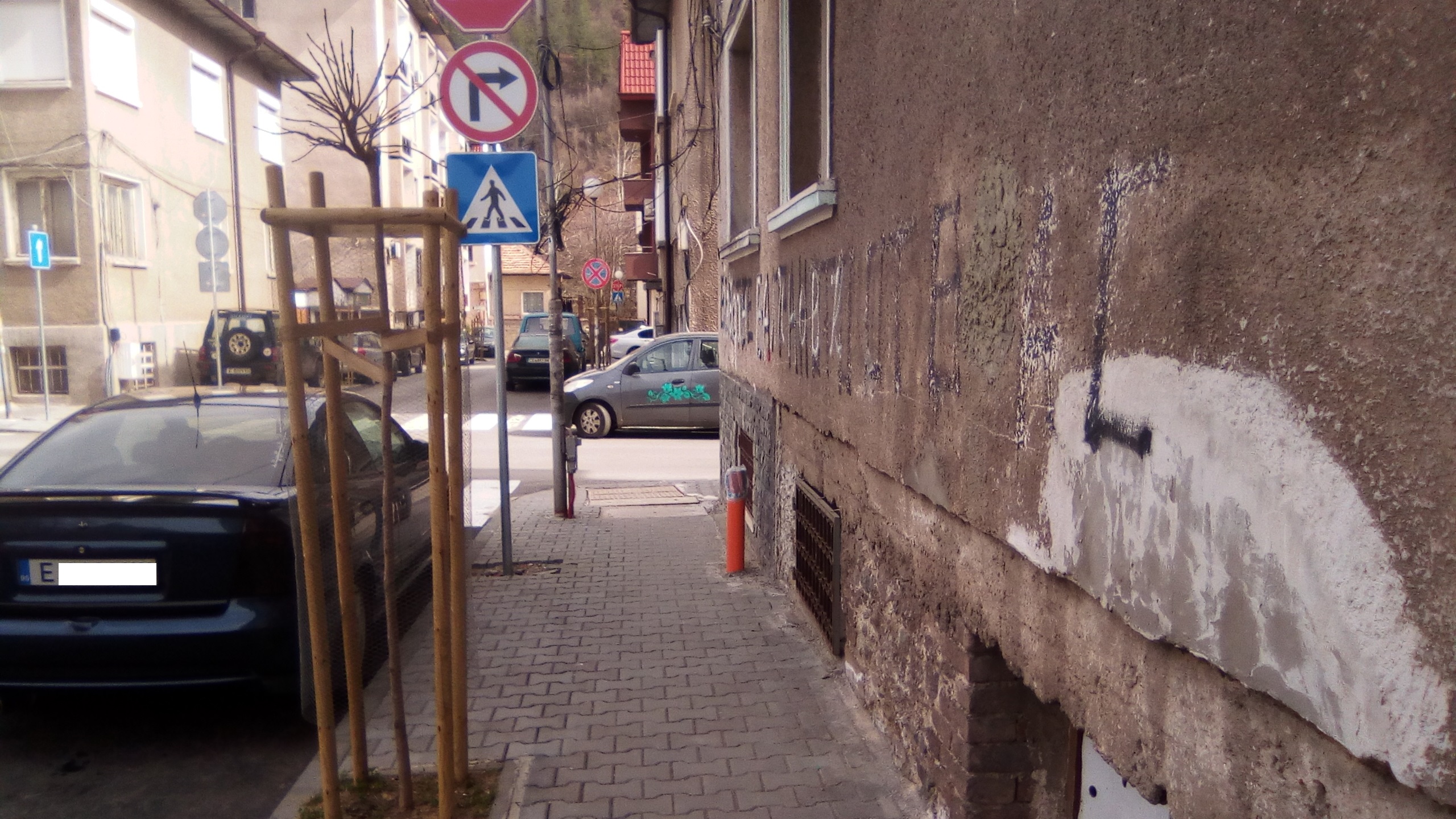 Две коли неправилно са паркирали, според мен, при хотела Е**** на тротоара и на улицата друга кола Е****, която пречи на видимостта при пресичане и създава опасна пътна обстановка.