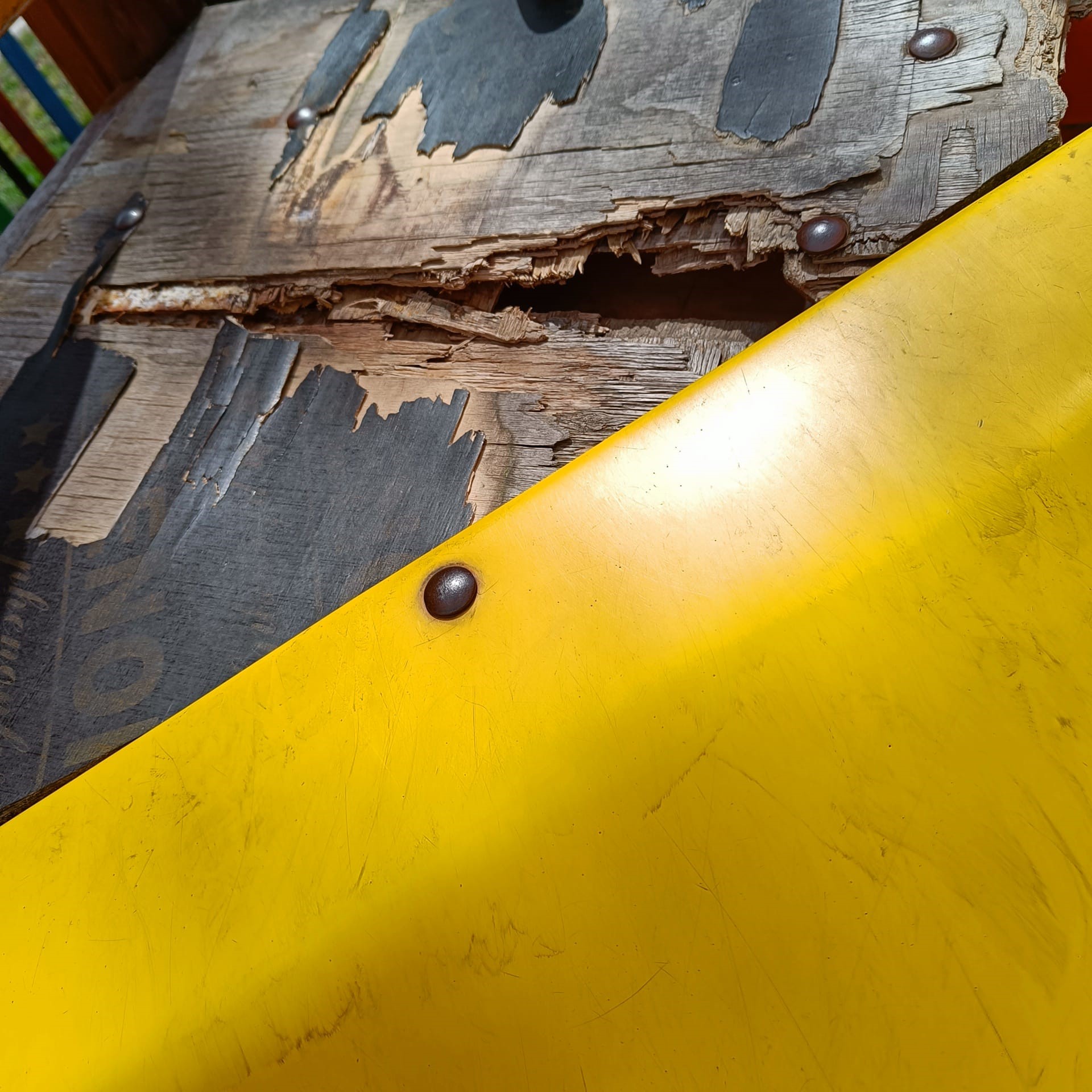 Между дървената платформа и жълтия юлией на пързалката има цепнатина, където детенце би могло да си заглави ръчичка или краче и да доведе до инцидент.
