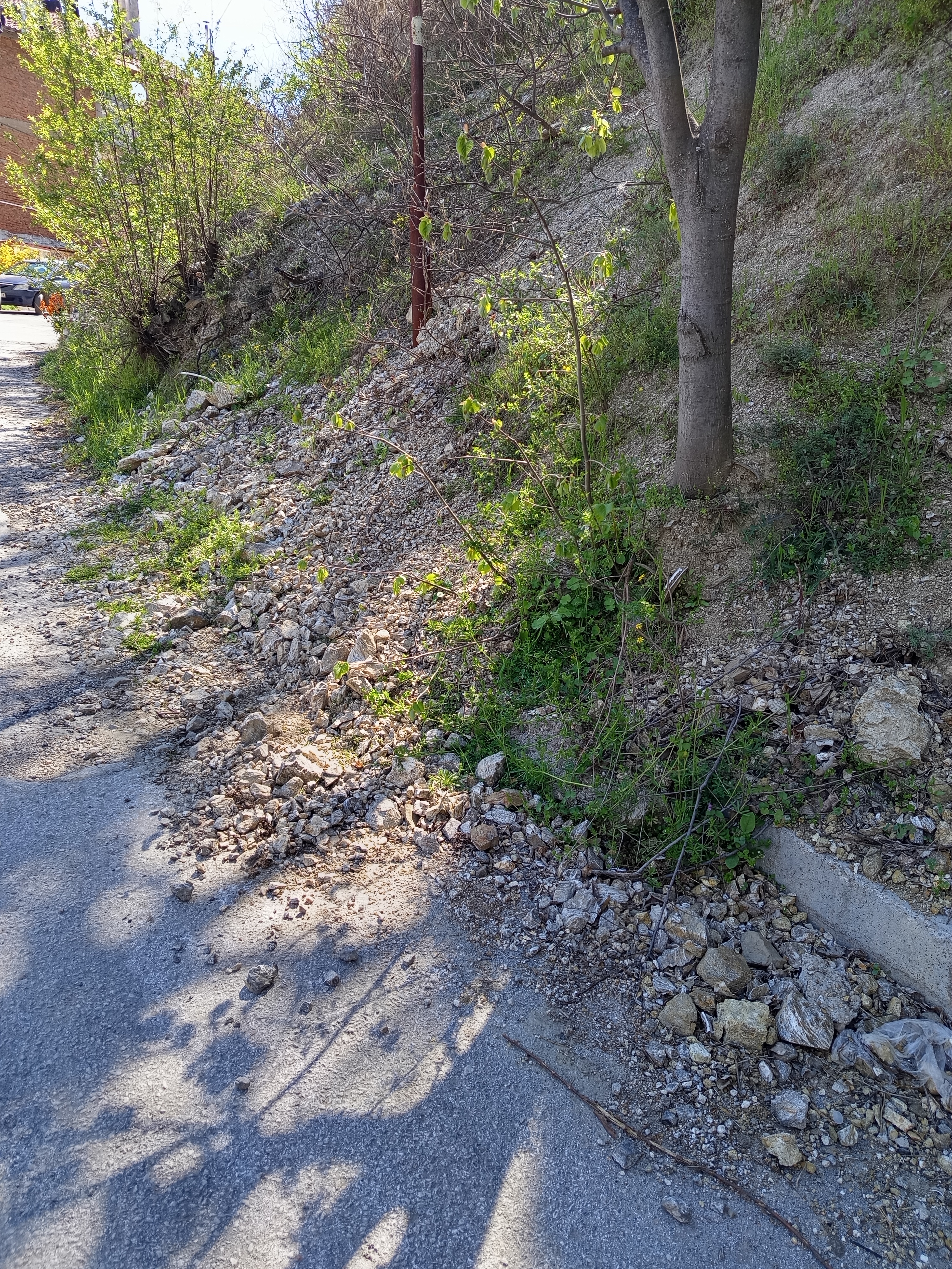 Свлечена земя на пътното платно и тротоар,а от другата страна пък подпалки изоставени и незаконна БАРАКА!