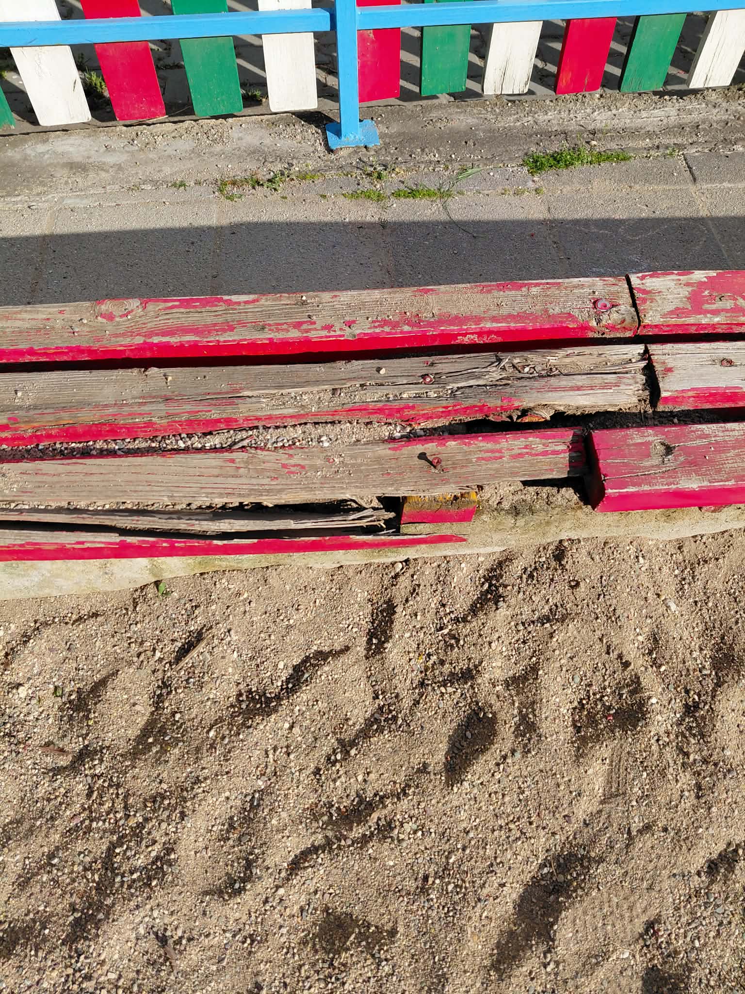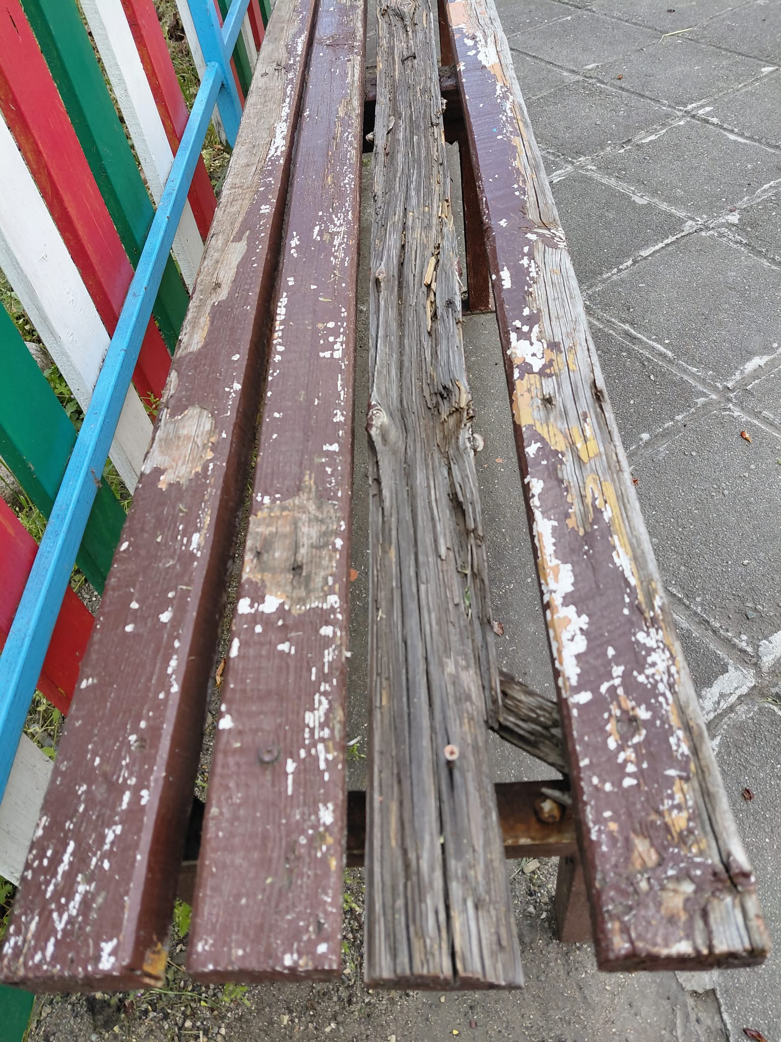 Освен това дъските/пейките са счупени и пироните са извадени- липсват дъски на места.