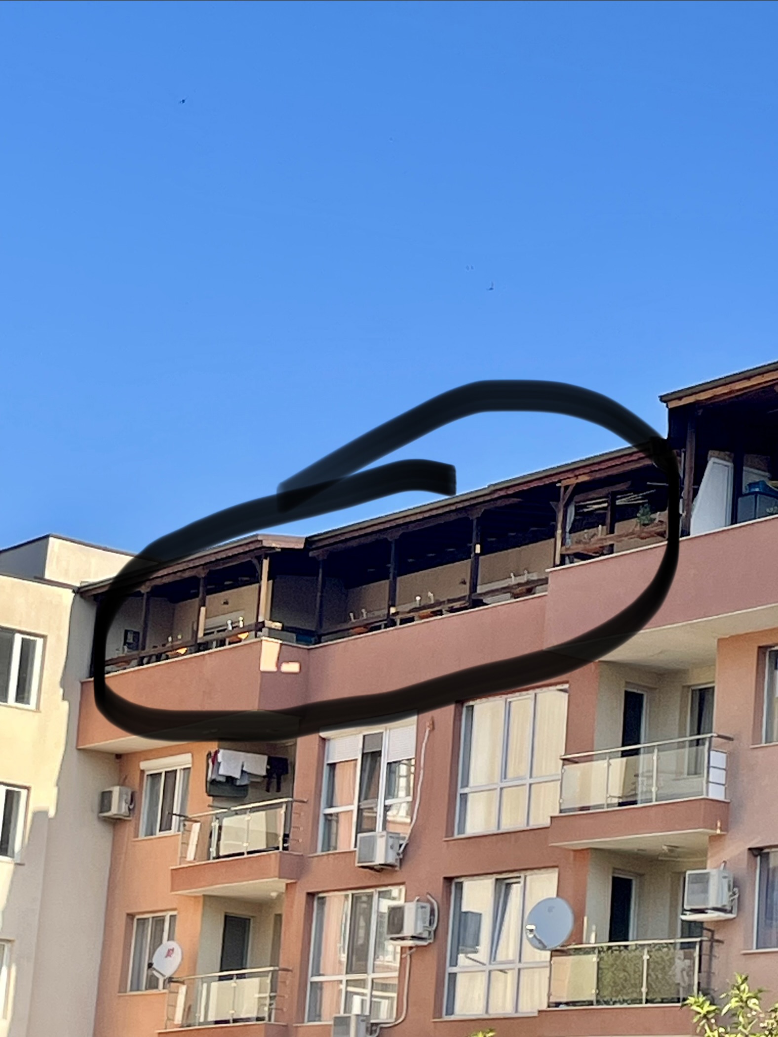 Подавам сигнал за незаконен навес на тераса в апартамент на ул. Преслав 3 - 21А в кв. Еленово, голямата кооперация над магазин Верос, на последен етаж. Собственици на имота и живущи в него са комшиите ни Георги и Десислава. Навесът е изграден от масивна дървена конструкция, която закрива слънцето на апартамента ми. Моля да бъдат взети нужните мерки за отстраняването му. Предвид евентуални будещи проблеми с комшиите бих желала сигналът ми да е анонимен. Имената по-долу, телефона, както и имейлът не са верни. Благодаря.